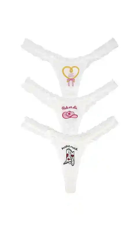 For Love & Lemons Bachelorette Thong Panty Pack of 3 in White. - size XL (also in L, M, S, XS) For Love & Lemons Bachelorette Thong Panty Pack of 3 in White. - size XL (also in L, M, S, XS) Self: 97% polyester 3% elastane Lining: 100% polyamide. Hand wash. Pull-on styling. Embroidered novelty graphi...more