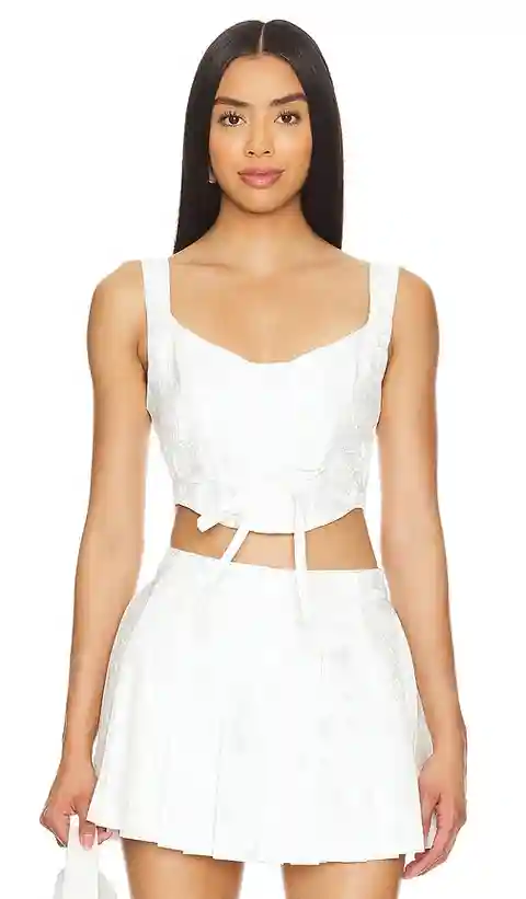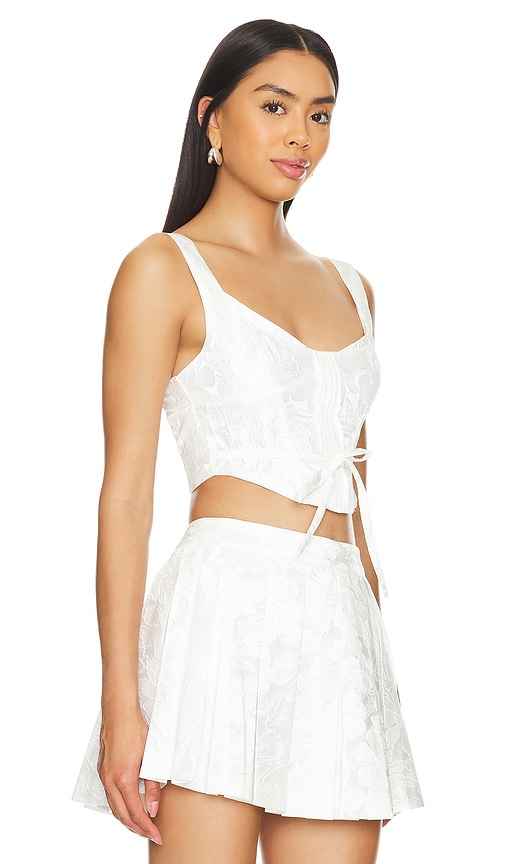 For Love & Lemons x REVOLVE Mira Crop in White. - size M (also in L, S, XS) For Love & Lemons x REVOLVE Mira Crop in White. - size M (also in L, S, XS) Self: 100% polyester Lining: 98% recycled polyester 2% spandex. Made in China. Dry clean only. Exposed back zipper closure. Lightweight jacquard fab...more