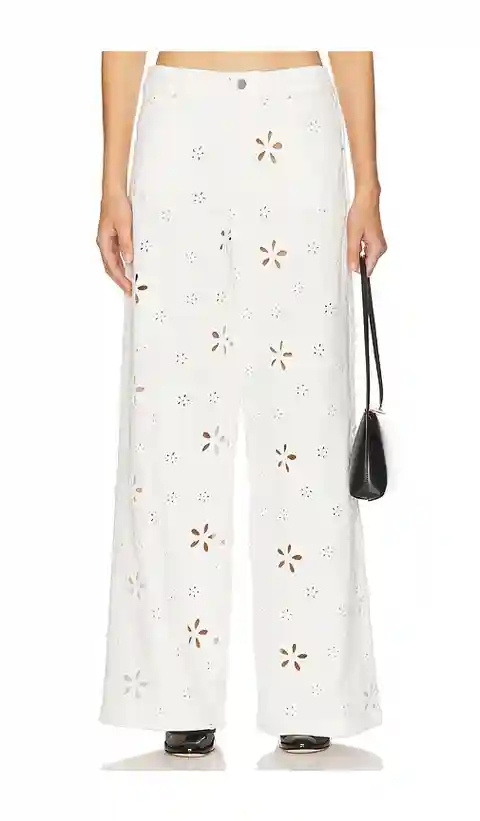 For Love & Lemons Daisy Eyelet Baggy Jean in White. - size XL (also in L, M, S, XS) For Love & Lemons Daisy Eyelet Baggy Jean in White. - size XL (also in L, M, S, XS) Self: 100% cotton Lining: 98% recycled polyester 2% spandex. Dry clean only. Zip fly with button closure. 4-pocket styling. Allover ...more