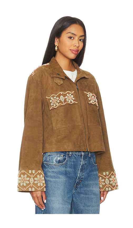 Free People Bali Fading Moon Jacket in Brown. - size L (also in M, S, XL, XS) Free People Bali Fading Moon Jacket in Brown. - size L (also in M, S, XL, XS) Suede textile. Professional leather clean recommended. Front zip closure. Breast flap pockets. Embroidered beaded detailing. Cropped fit. Heavyw...more