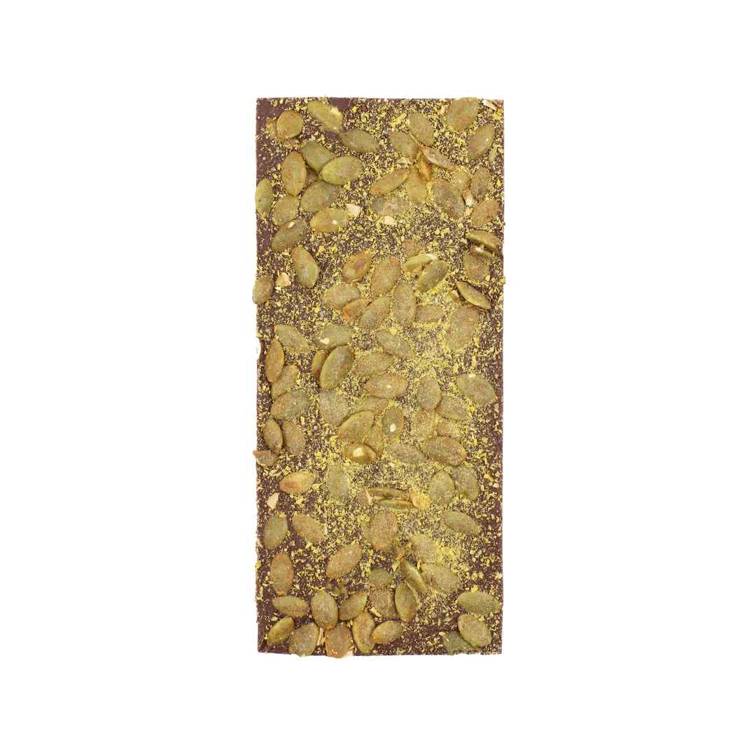 Spring Salted 56% Dark Milk Chocolate with pepitas and spiced pumpkin. This special seasonal bar is made in collaboration with Westwind orchard. <...more
