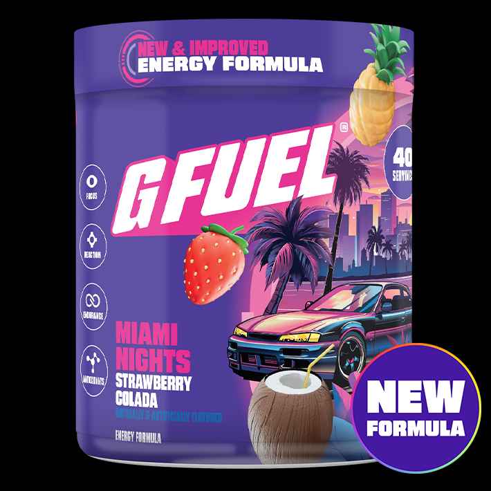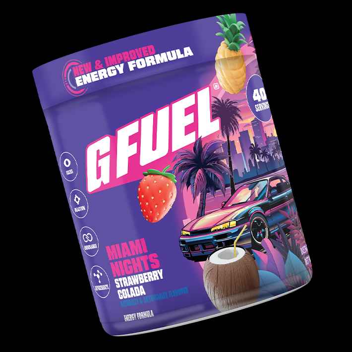 Your white Ferrari Testarossa is rolling down Ocean Drive. It's hot, but you always know how to stay cool. You pull down your Wayfarers and see the new neon colors of a G FUEL Miami Nights Tub in your passenger seat. That refreshing Miami Vice-inspired, juicy mix of strawberry, coconut, and pinea...