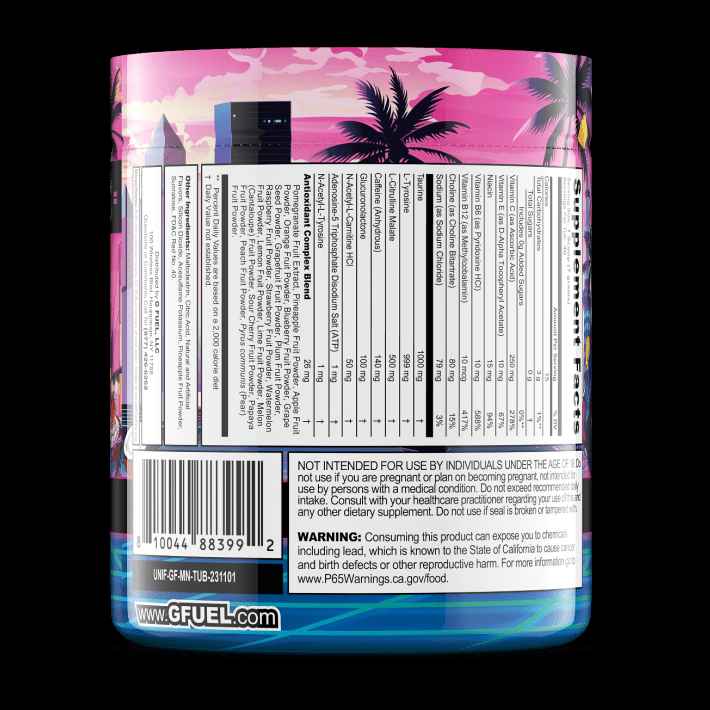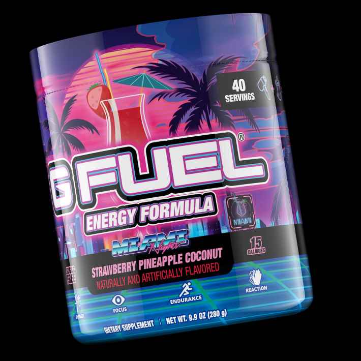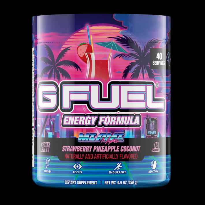 Your white Ferrari Testarossa is rolling down Ocean Drive. It's hot, but you always know how to stay cool. You pull down your Wayfarers and see the new neon colors of a G FUEL Miami Nights Tub in your passenger seat. That refreshing Miami Vice-inspired, juicy mix of strawberry, coconut, and pinea...