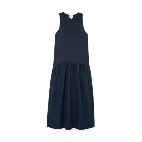 G. Label by goop Shannon Dropped-Waist Tank Dress in Navy, Size 2: Up top, it has a tank-style bodice done in tissue-weight cotton jersey; below, a crisp poplin skirt hovers away from the body. Feminine details, like the low-cut scoop neck and curved seam at the waist, add a dose of elegance to all ...more