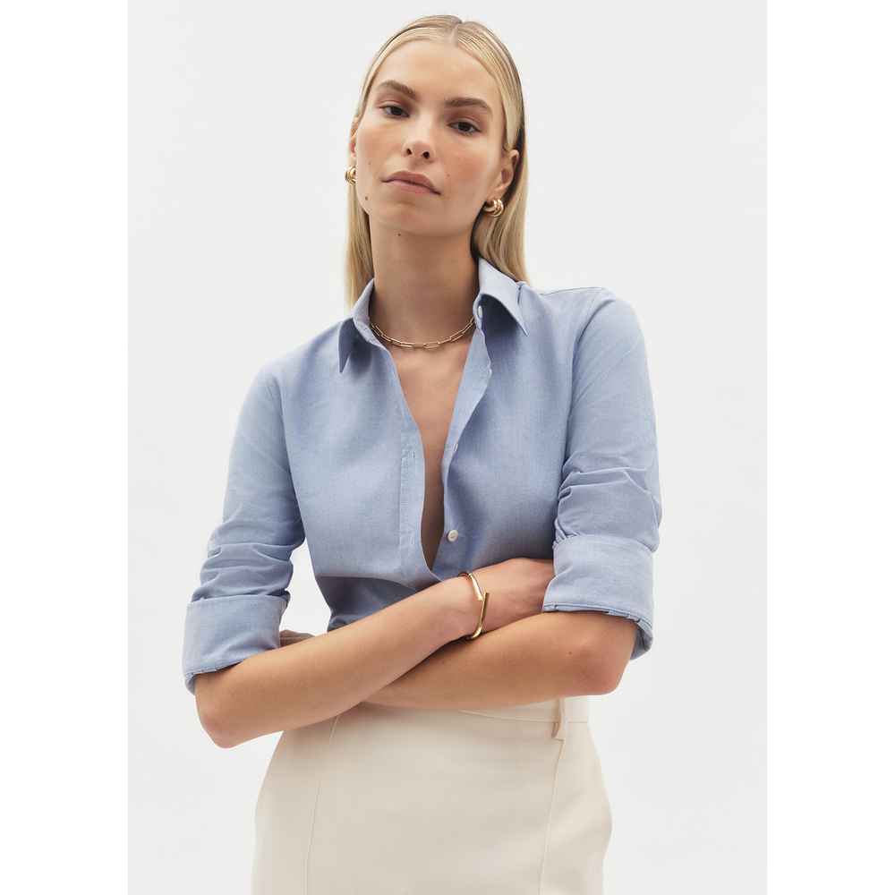 G. Label by goop ONeill Boy Button-Down in Blue, Size 12: ONeill borrows the best elements from mens shirtingspread collar, round cuffsand couples them with a flattering straight silhouette. The blue Oxford shirting is the ideal weight: substantial enough to wear solo (do it all the way up or leave ...more