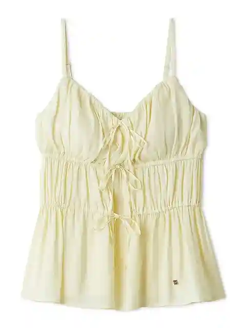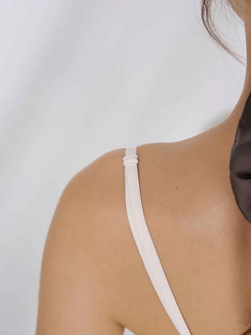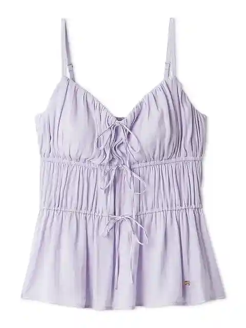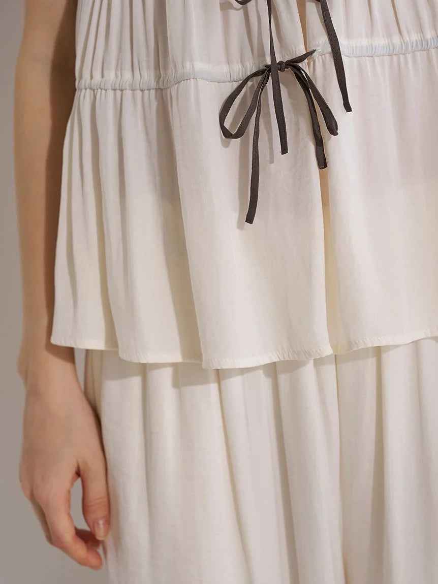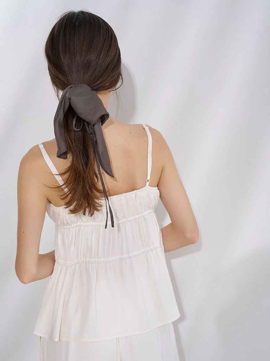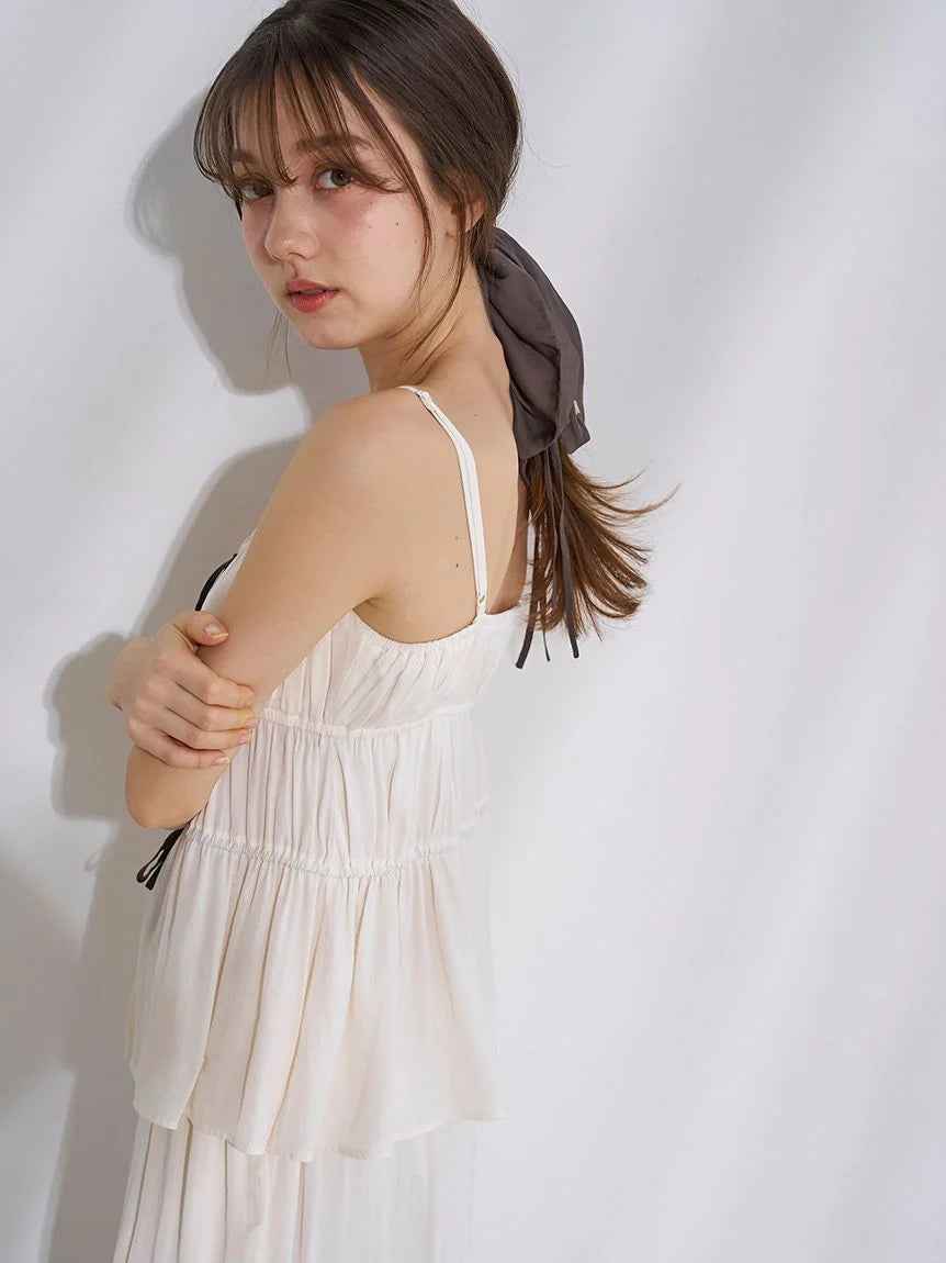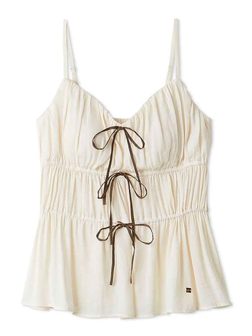 [Satin camisole with delicate ribbons combined with gathers][Design/Styling]A series that combines delicate ribbons with matte satin that has a beautiful, airy texture and a subtle sheen. A cup-in camisole with a feminine presence, with gathered gathers. The front has a delicate ribbon detail, and t...more