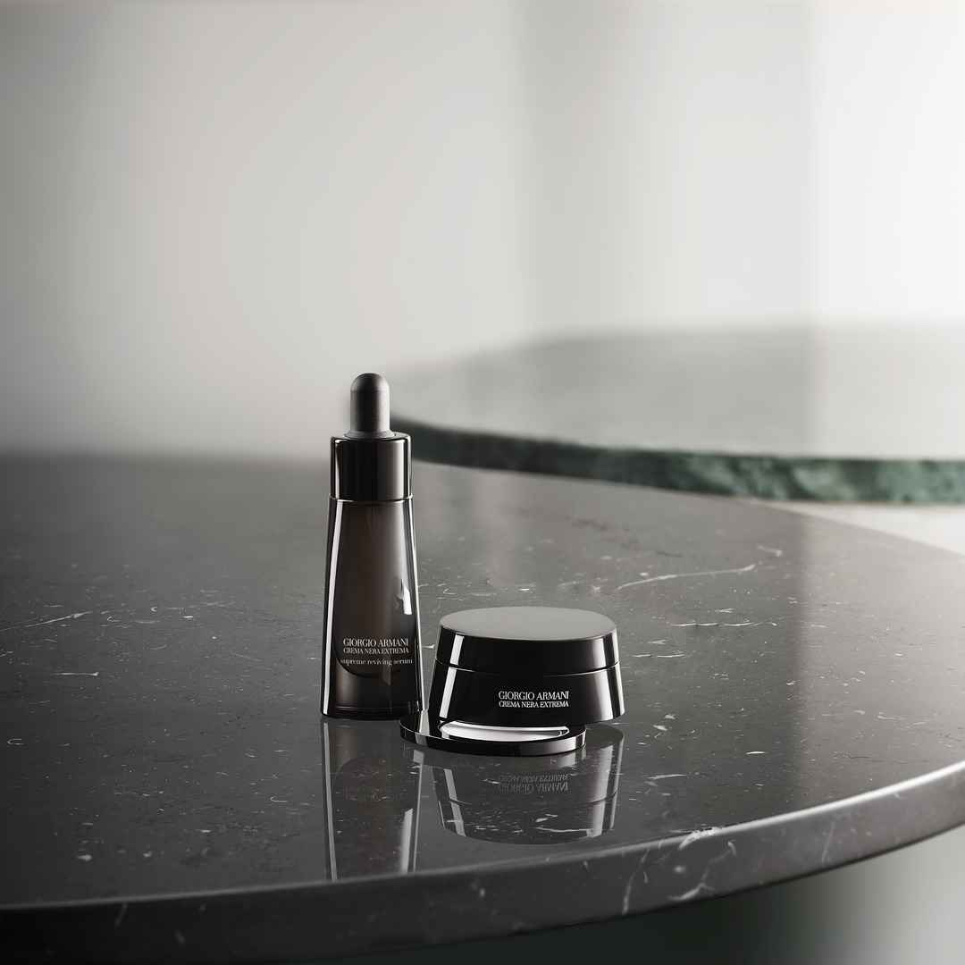 Reshape the delicate contours of the eye area with Giorgio Armani Beauty's Volume Reshaping Eye Serum to firm and lift delicate skin in the eye area. | Armani Beauty Crema Nera Volume Reshaping Eye Serum - 0.5 Oz/15 ml | 0.5 oz./15 ml Small