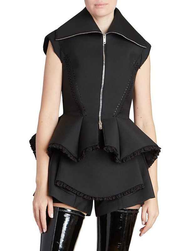 Constructed of bonded wool and mohair, this sleeveless zip-up jacket features a defining peplum hem and tonal lace trim. Convertible stand collar Sleeveless Zip-up front Silvertone hardware Lining: 100% cupro 73% wool/27% mohair Dry clean Made in Italy SIZE & FIT About 27 from shoulder to hem Mo...more
