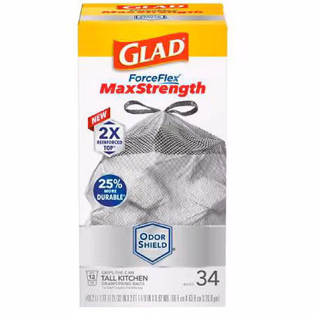 Glad ForceFlex MaxStrength Tall Kitchen Trash Bags provide strength and odor fighting technology to help your kitchen smell fresh. These 13 gallon bags are 25% more durable* with a 2X reinforced top* to pull and carry, helping prevent rips at the top of the bag. It also features an outer leak protec...more