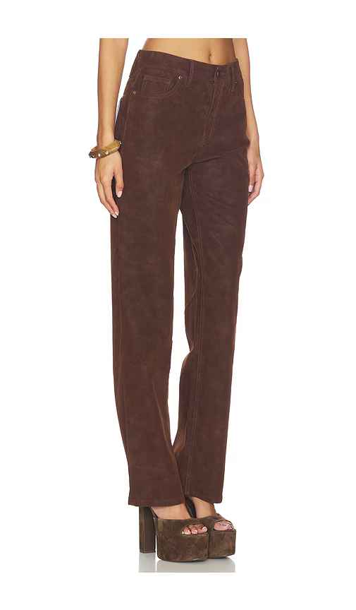 Good American Better Than Suede Good True Straight Pants in Chocolate. - size 00 (also in 10, 12, 6, 8) Good American Better Than Suede Good True Straight Pants in Chocolate. - size 00 (also in 10, 12, 6, 8) Self: 100% polyurethane Backing: 100% viscose. Made in China. Hand wash cold. Zip fly with b...more