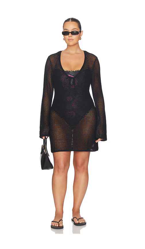 Good American Crochet Mini Dress in Black. - size L (also in M, S, XS) Good American Crochet Mini Dress in Black. - size L (also in M, S, XS) 65% rayon 35% nylon. Hand wash. Unlined. Pull-on styling. Front tie design. Ribbed trim. Midweight crochet fabric. Garment is intentionally sheer, undergarmen...more