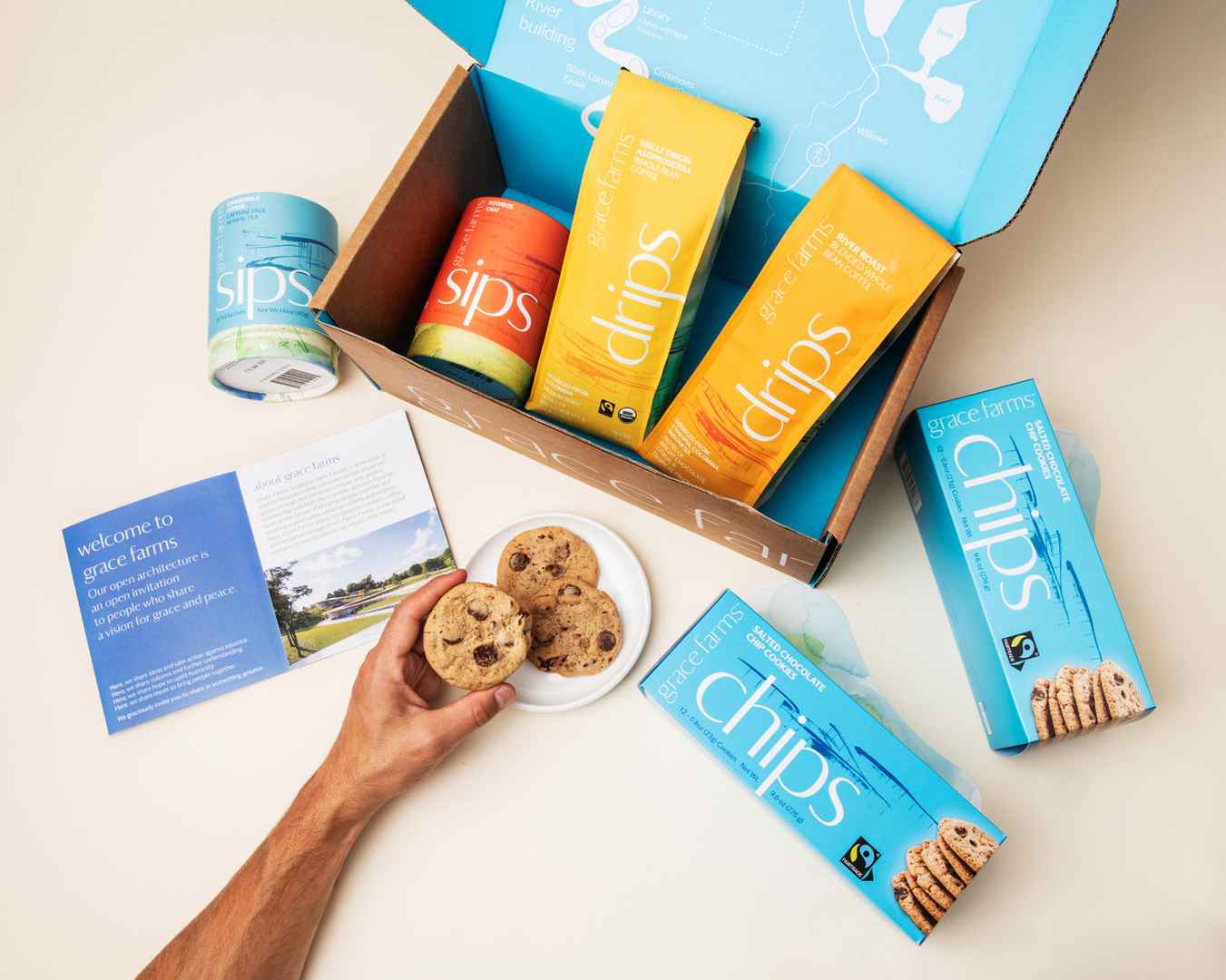 One of our most popular gift boxes, The Joy of Two includes two boxes of our signature Salted Chocolate Chip Cookies, two bags of whole bean coffee, and two canisters of organic herbal tea.
