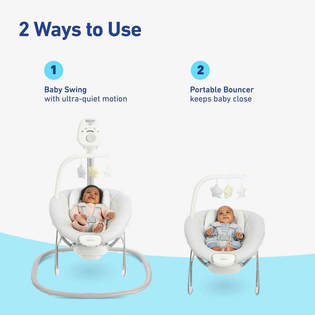The Graco Sway2Me Swing with Portable Bouncer offers a gentle swaying motion and a 3-position seat for side-to-side or front-to-back swinging. The swing seat doubles as a portable bouncer so you can keep baby content by your side as you move from room to room. The Graco Sway2Me Baby Swing with Porta...more