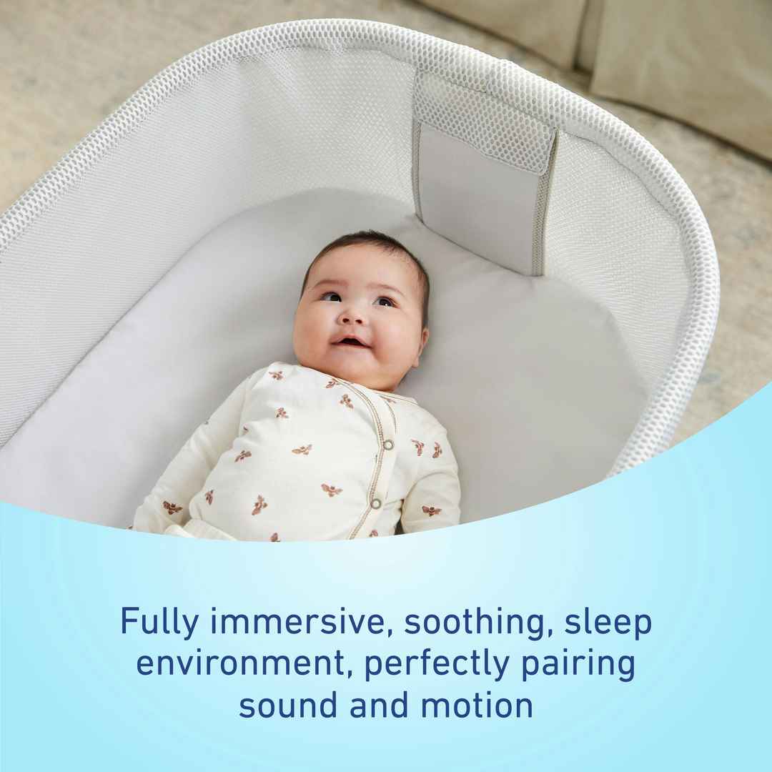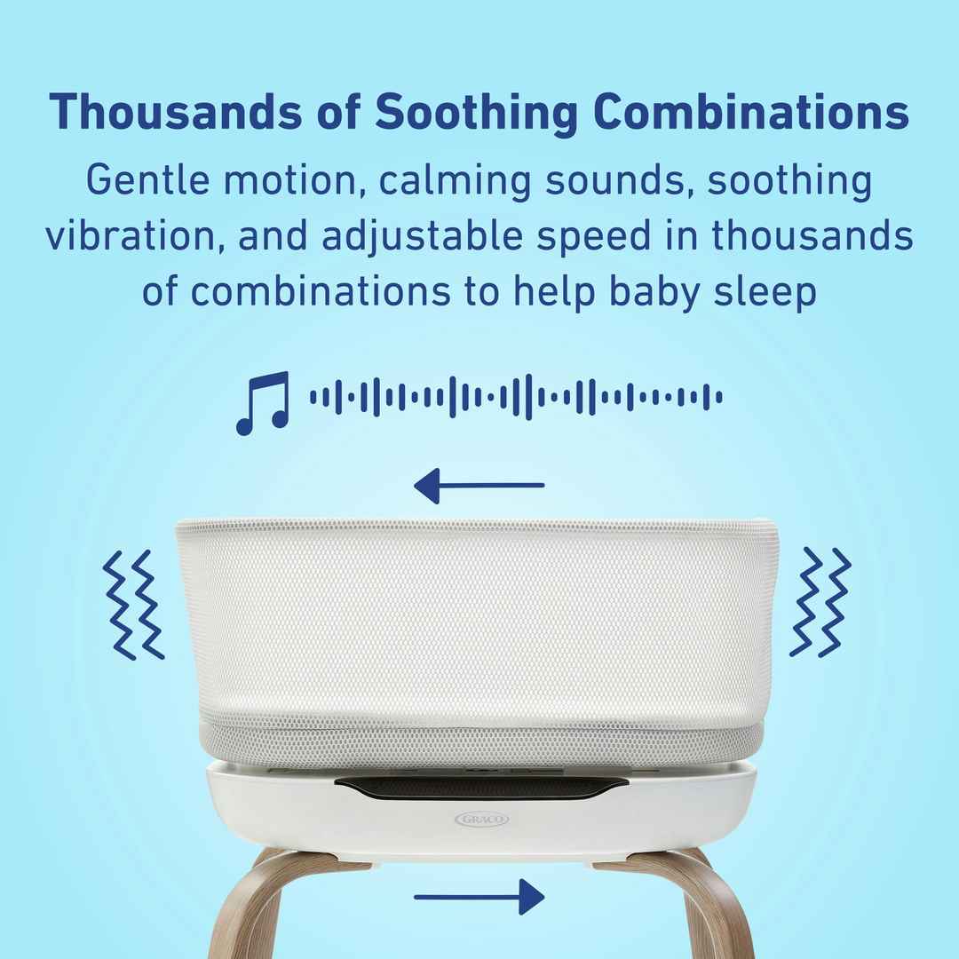 The Graco SmartSense Soothing Bassinet starts to soothe your baby in seconds, with soothing technology that hears your baby's cries and responds with soothing combinations of sound and motion. The Graco SmartSense Soothing Bassinet hears your baby's cries and responds with synced sound and motion, h...more