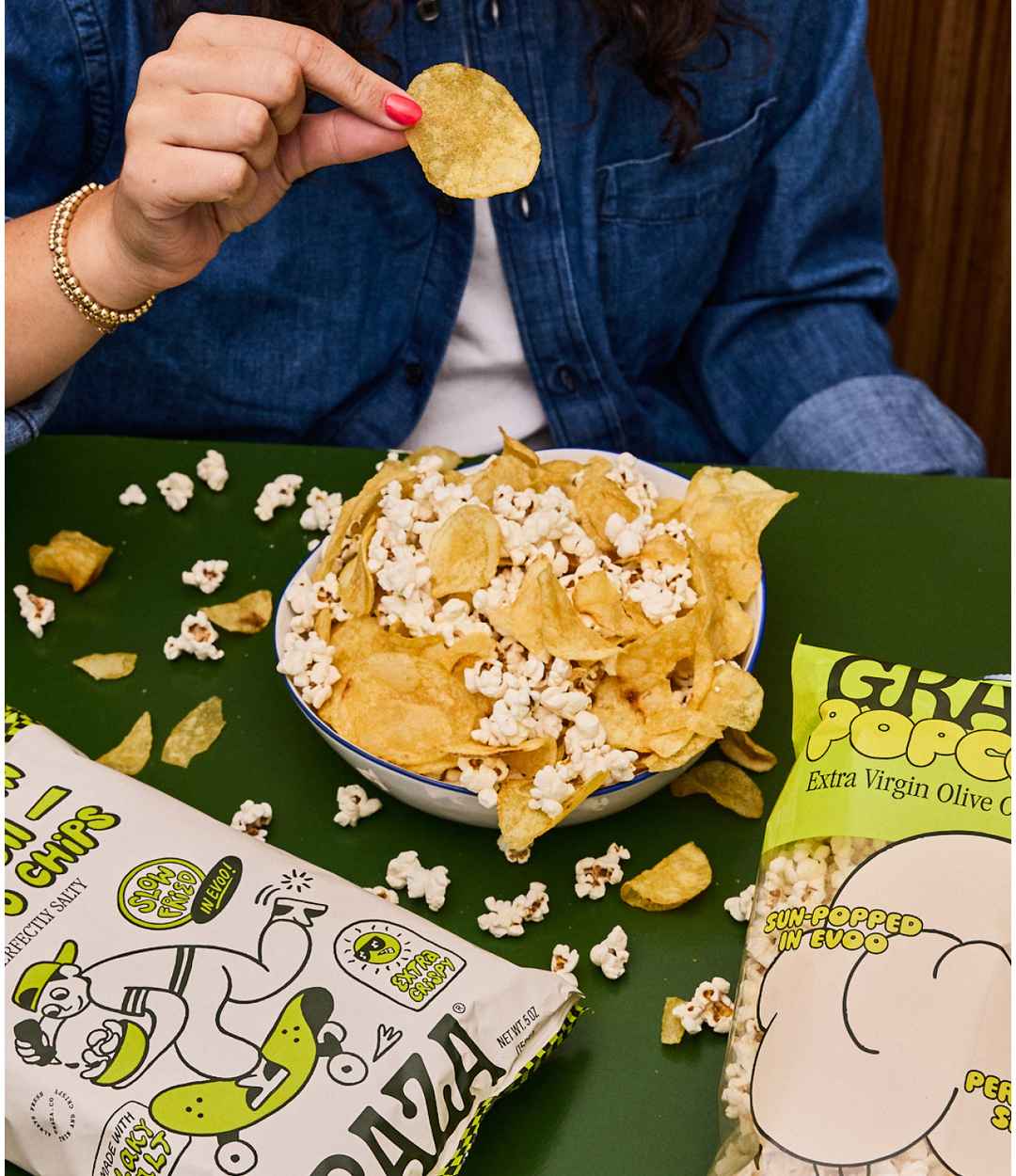 Two bags of EVOO Potato Chips and two bags of EVOO & Sea Salt Popcorn!