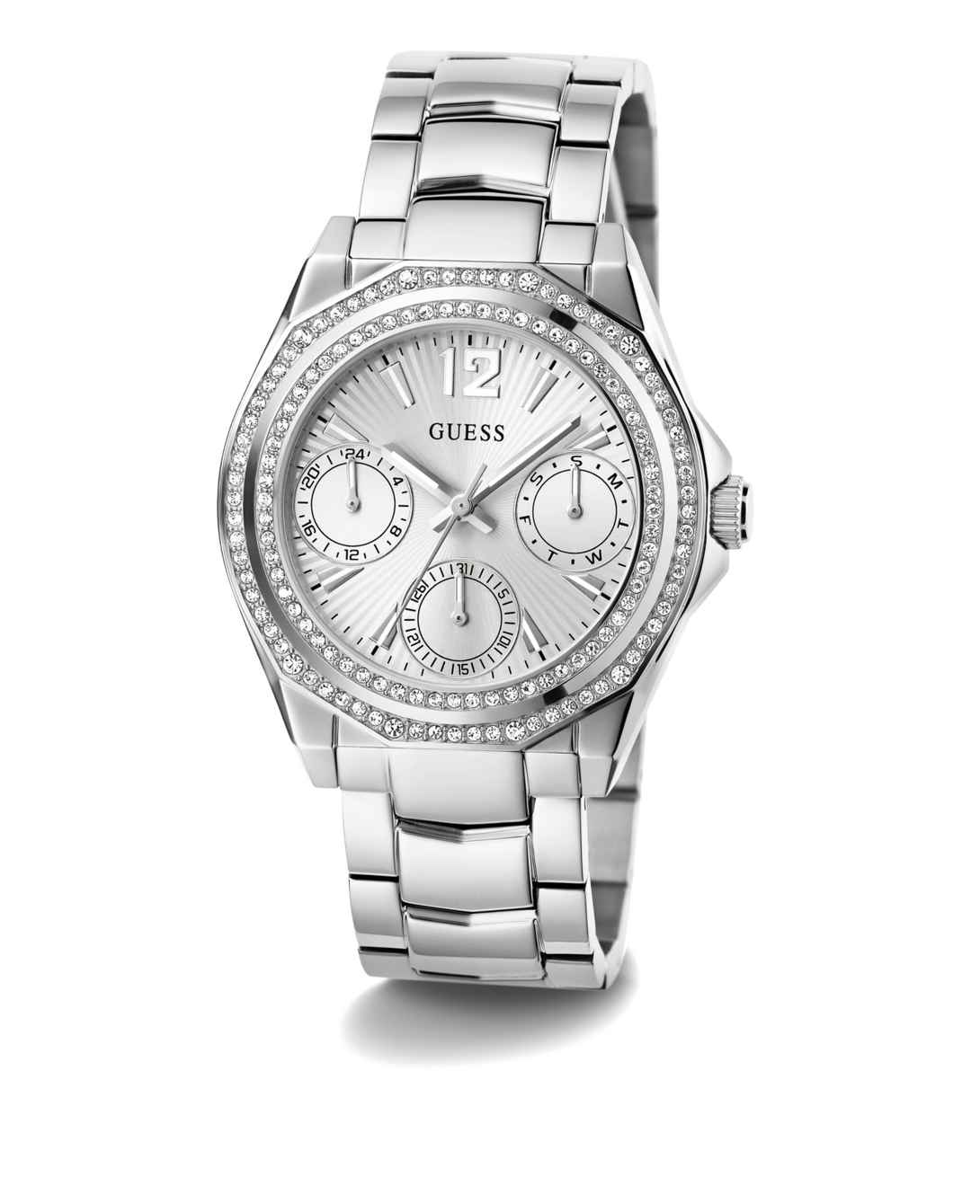 Put on the Ritz with this glam new multi-function bracelet that features a double row of crystals on its bezel. Style #GW0685L1
