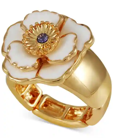 Always in bloom, a brilliant flower is featured from this Guess statement ring.