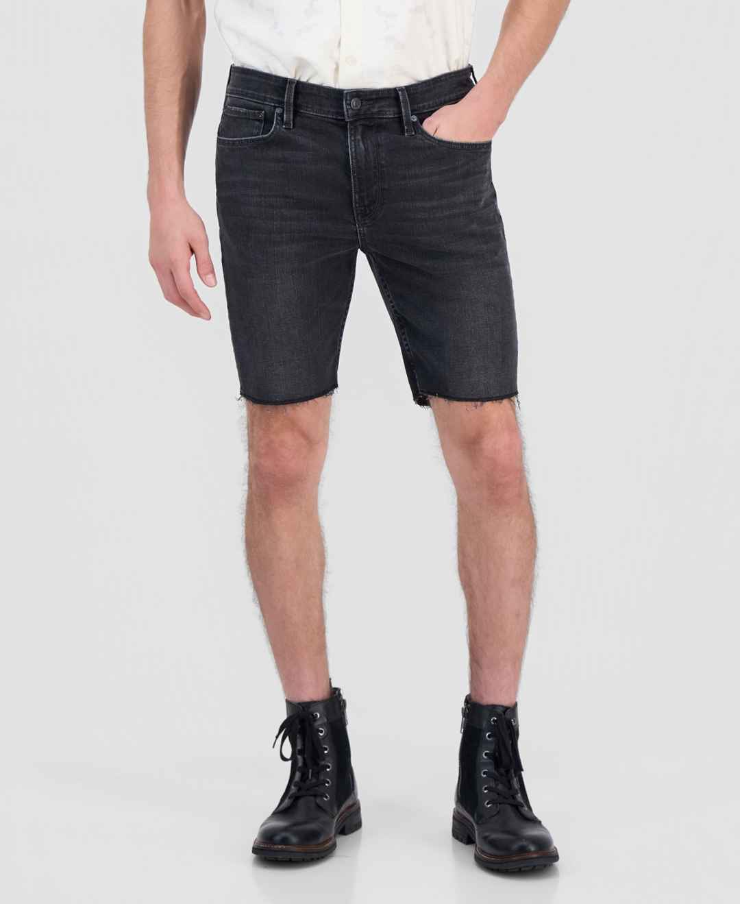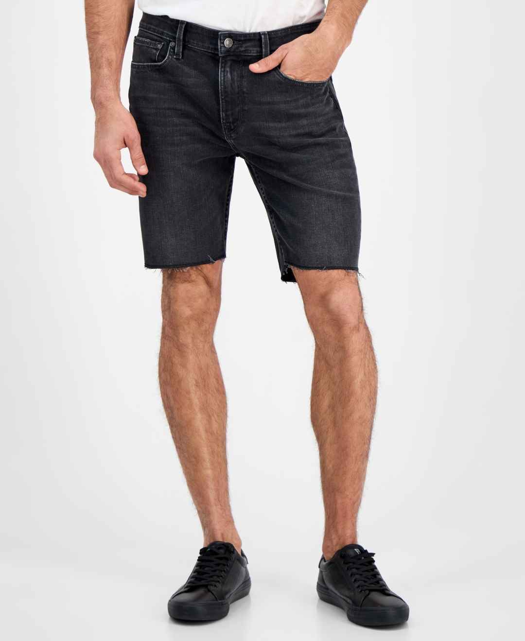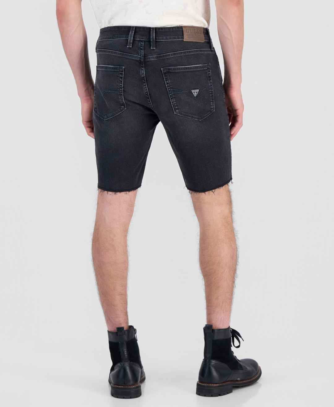 These slim fit jean shorts feature a 9" inseam, zip fly with button closure, 5 pocket construction, and triangle Guess patch at the back pocket.