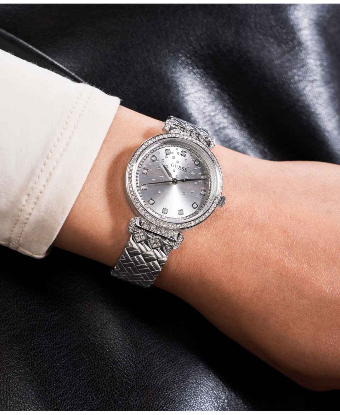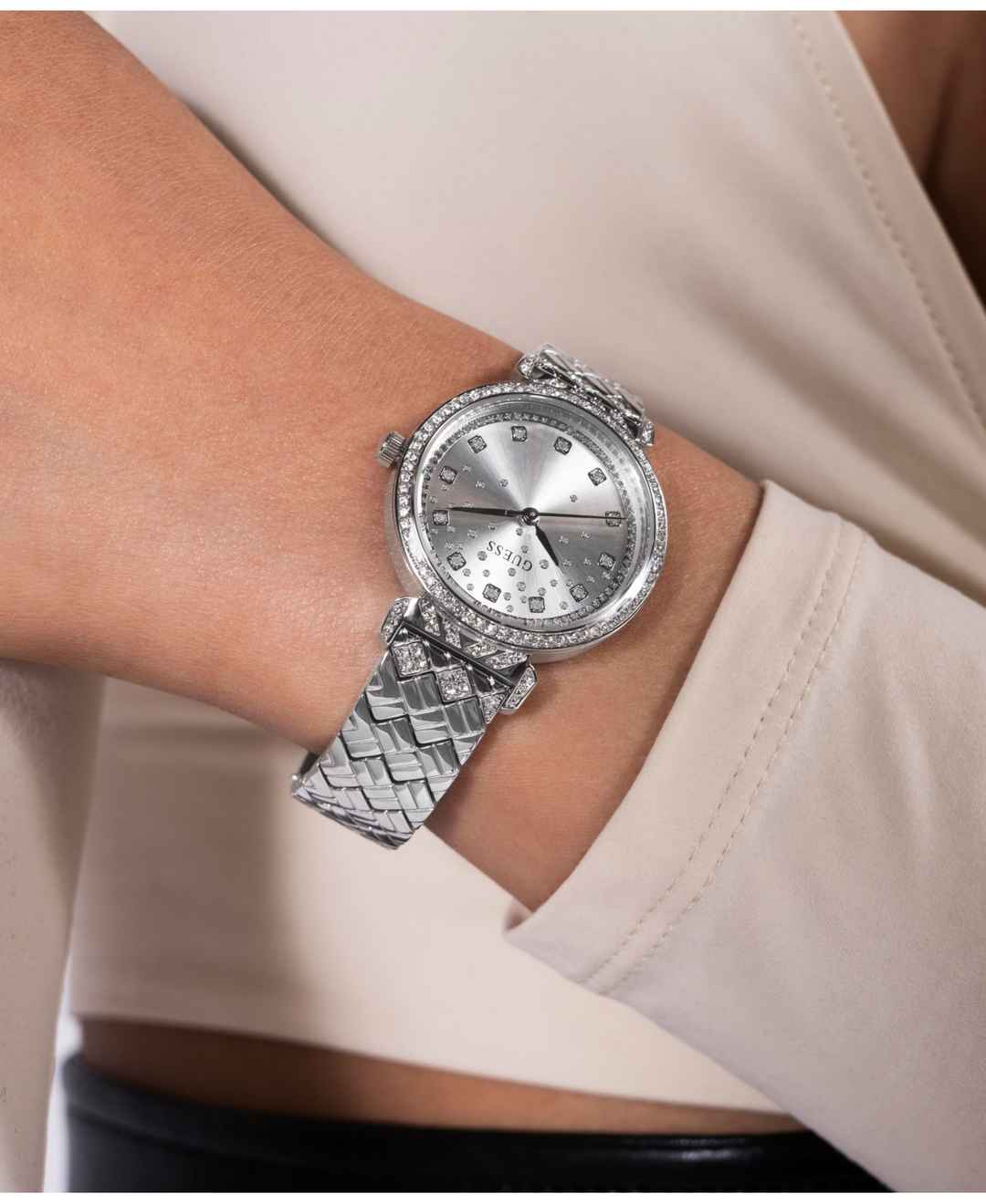 Find enchantment with this beautiful, bejeweled silhouette featuring a stoned bezel and a cascading glitz dial and a quilted bracelet.
