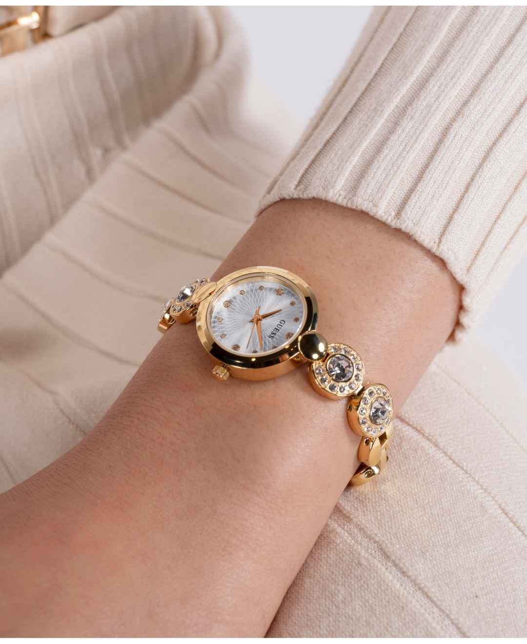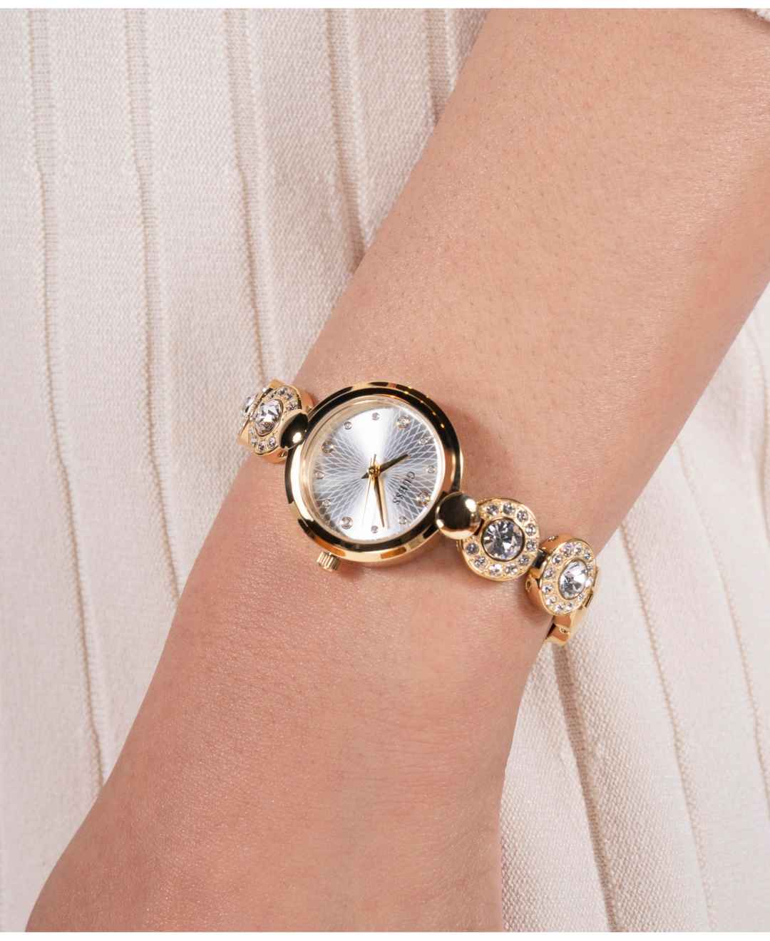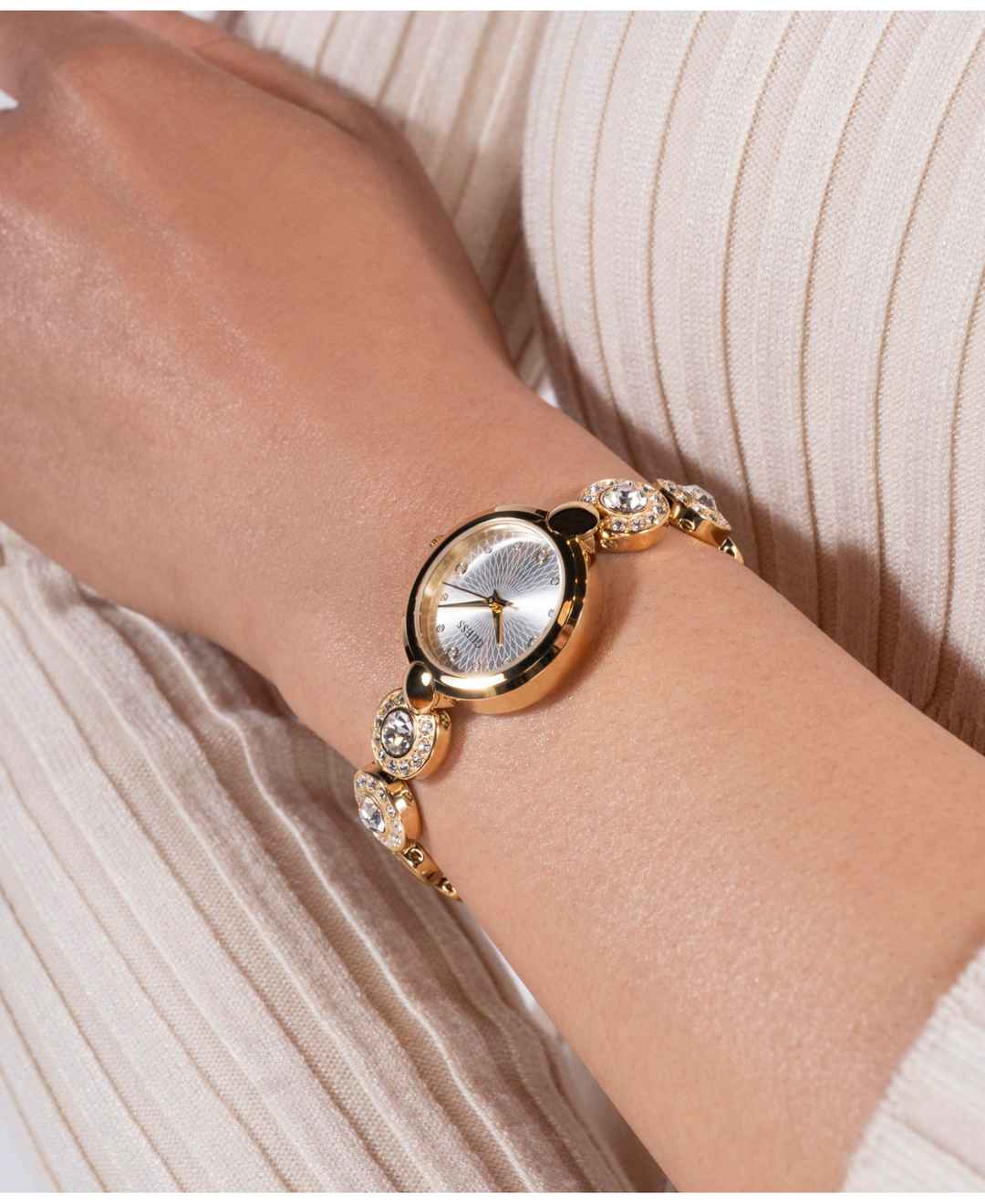 This new jewelry style is sure to launch your wrist into stardom with a textured dial and 2 crystal links on either side of the case. Self-adjustable g-links make this style easy to size. Great on its own or stacked with other jewelry