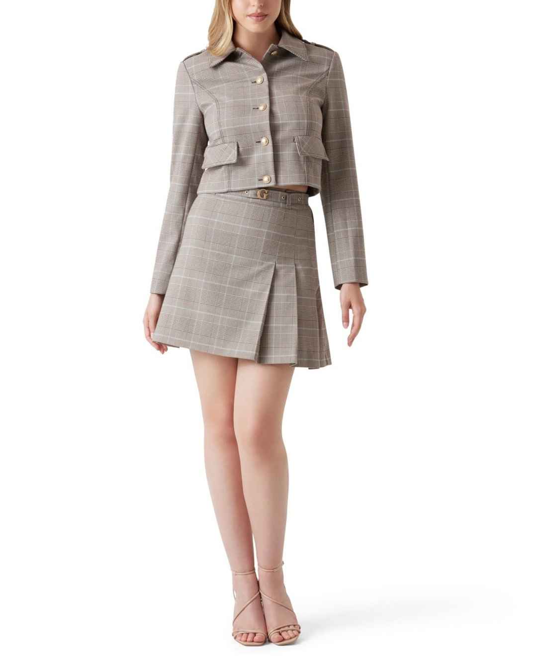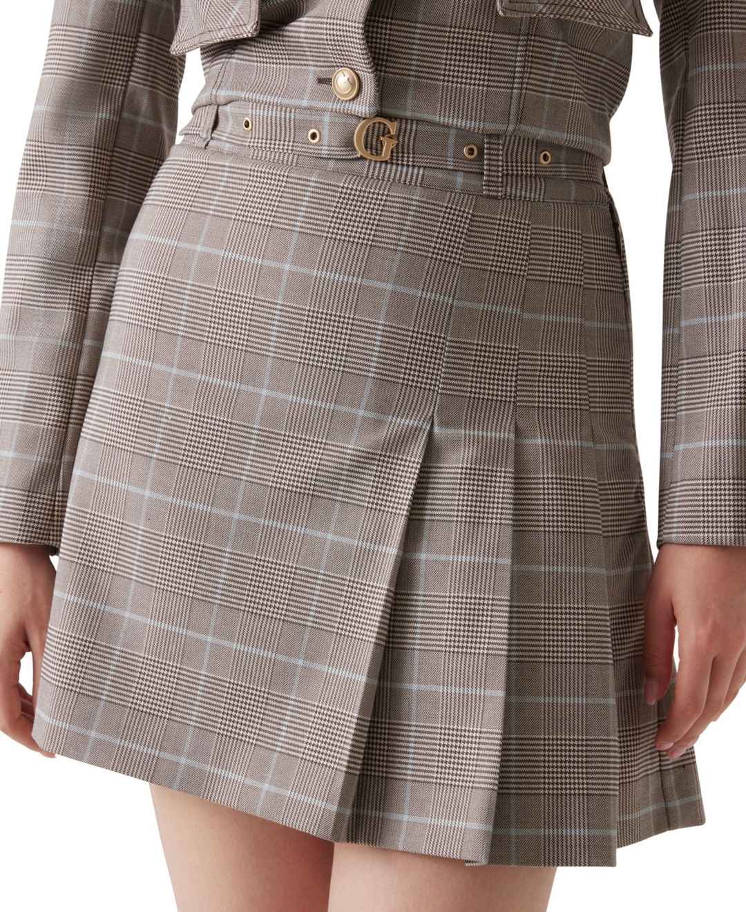 Boasting a flare mini silhouette, this skirt by Guess includes a pleat at the back and a side zipper for a dynamic shape. A plaid pattern and 'G' belt add a polished, branded touch.