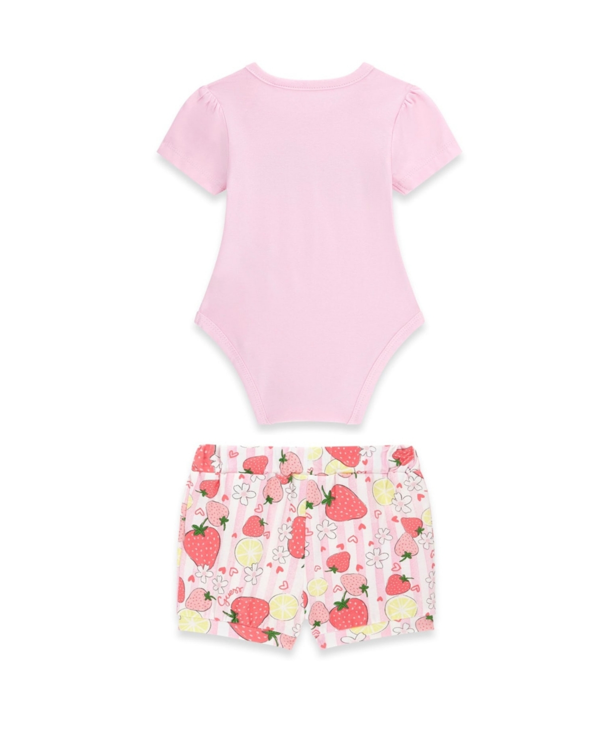 Stretch cotton jersey short sleeve bodysuit with glitter print logo and pull on strawberry lemonade logo print short 2 piece set.