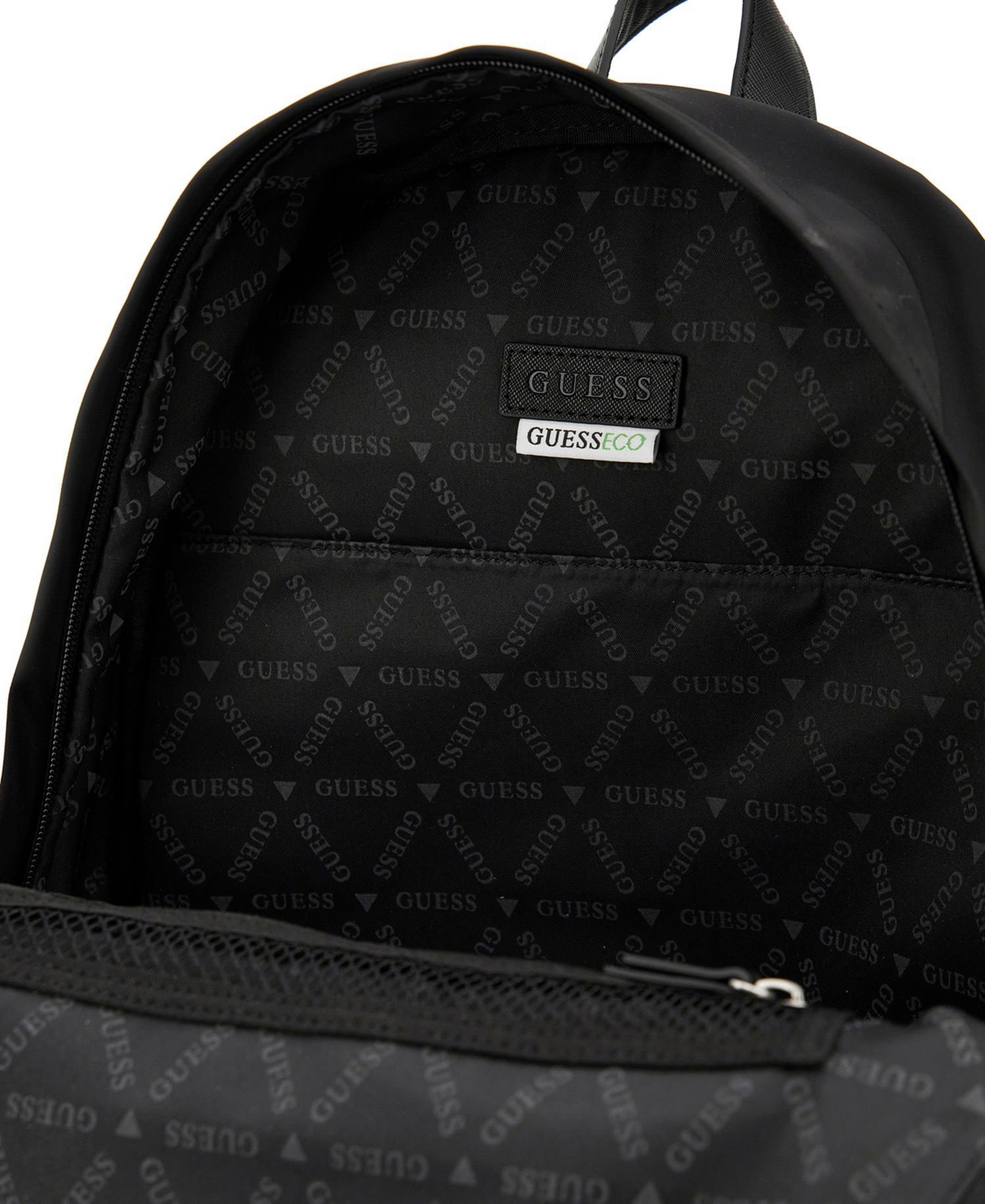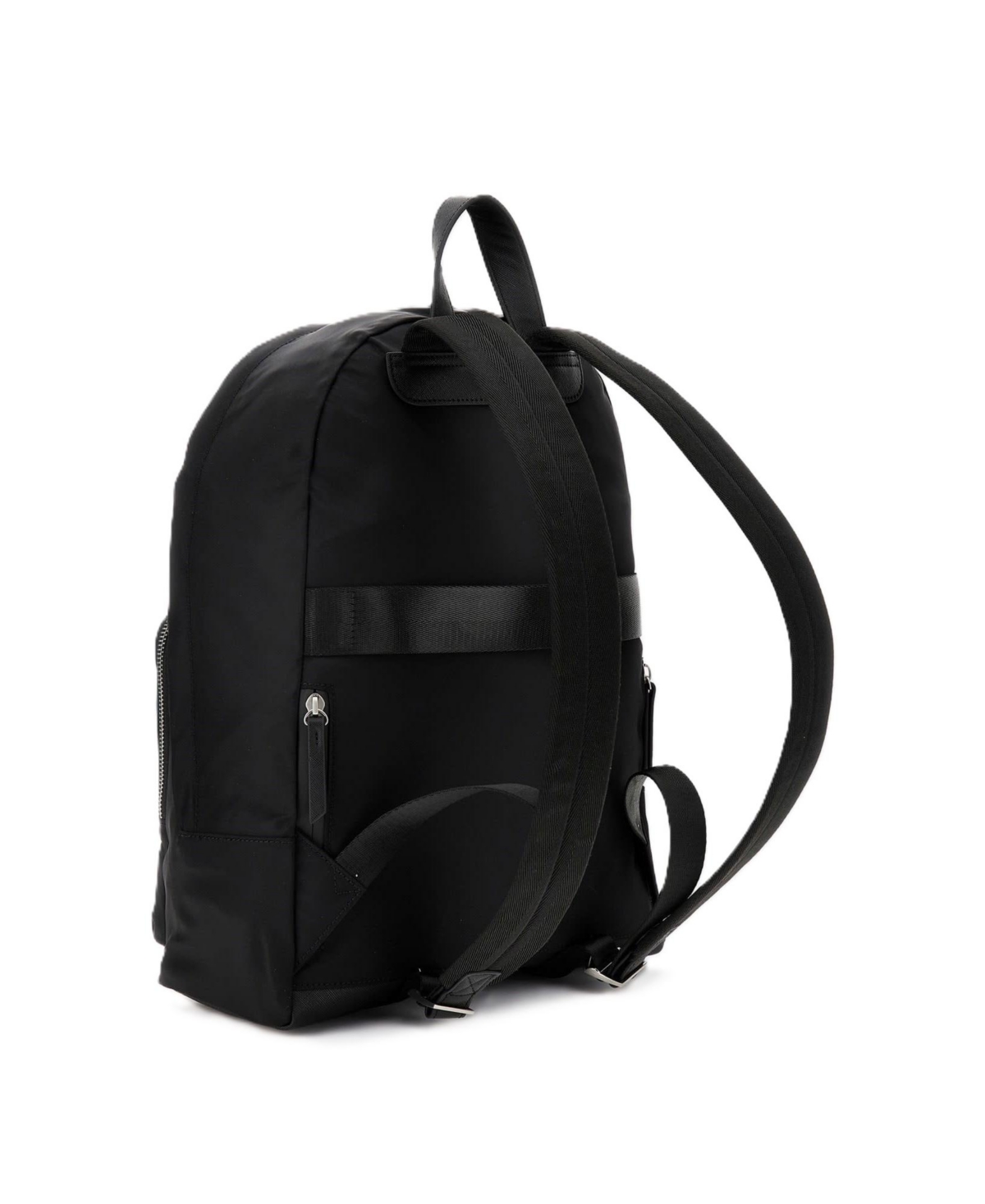 Compact nylon backpack silver tone hardware enamel signature triangle emblem single compartment construction. Front exterior zip pocket padded adjustable backpack straps.