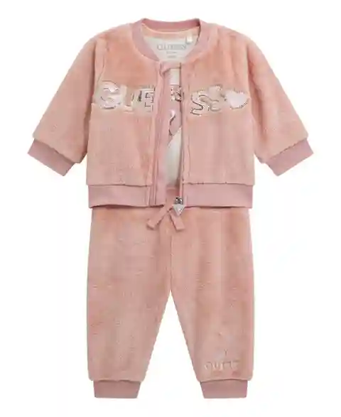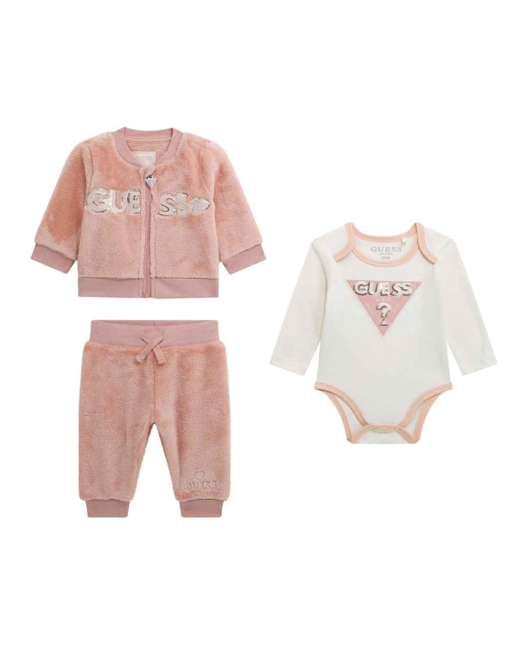 Offering plush velour comfort, this Guess set combines a sweatshirt, long-sleeve bodysuit, and sweatpants. The embossed embroidery with sequins adds a luxurious and detailed touch to the ensemble.