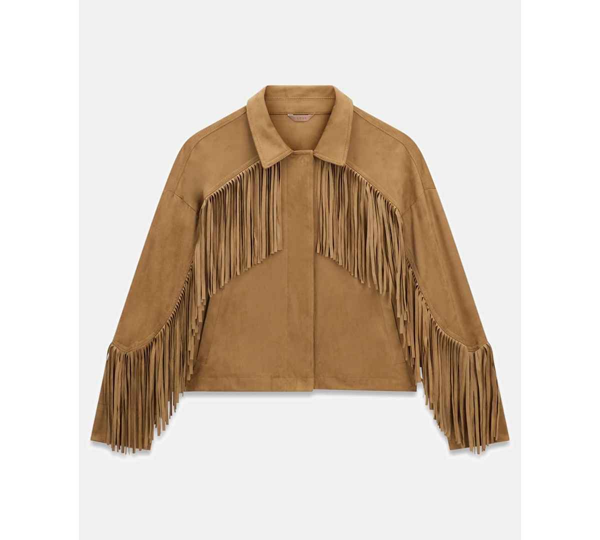 Crafted for bold, standout layering, this Guess jacket features a collared neckline and long sleeves with fringe detailing on the chest. A button-front closure adds structure and timeless functionality to the design.