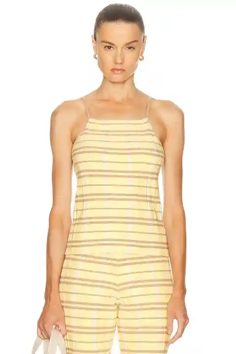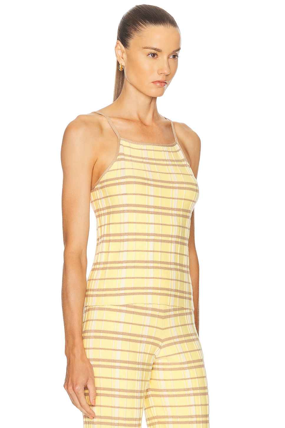Guest In Residence Plaid Tank Top in Yellow 60% silk 26% linen 12% nylon 2% elastane. Hand wash. Pull-on styling. Midweight ribbed knit fabric. Item not sold as a set. GUEF-WS74. W31522RL. About the designer: