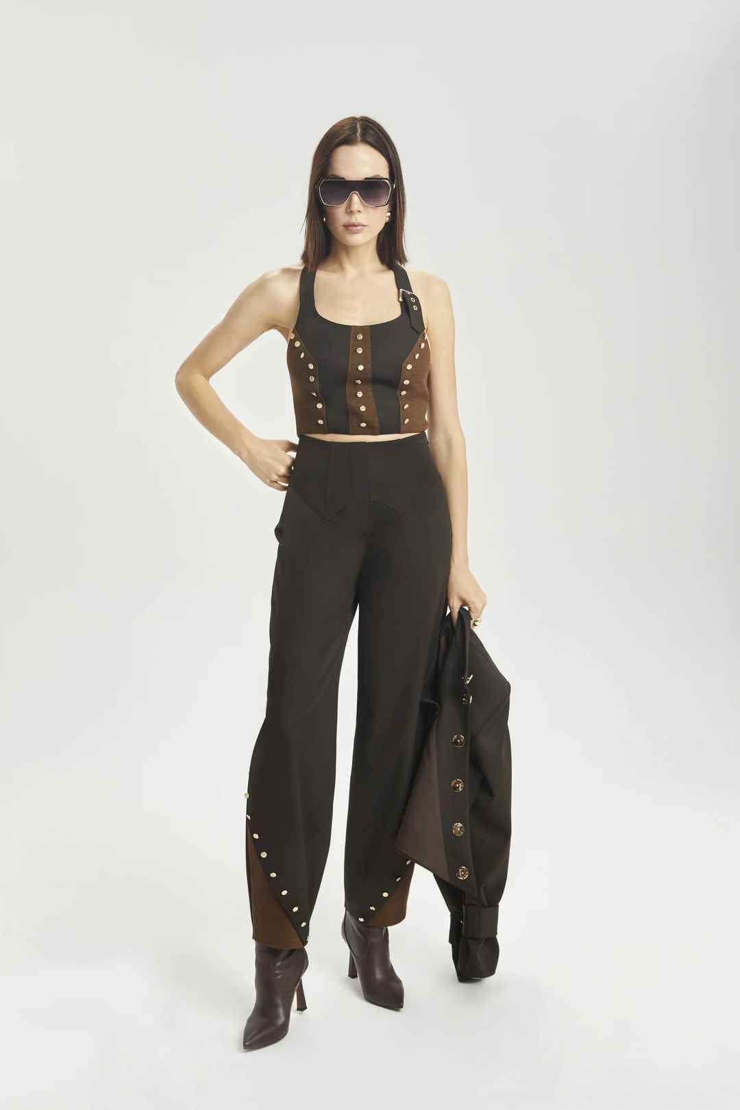 Two-tone top, gold front buckle detail, gold grommets and back zipper.