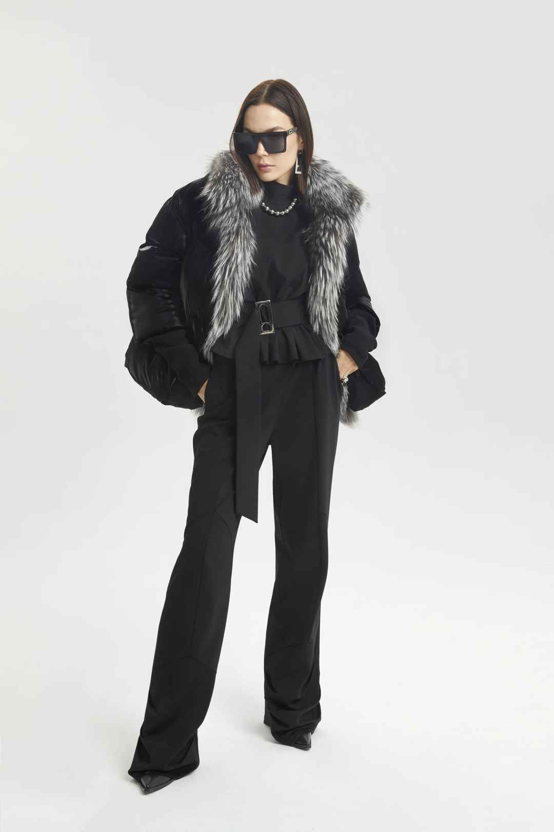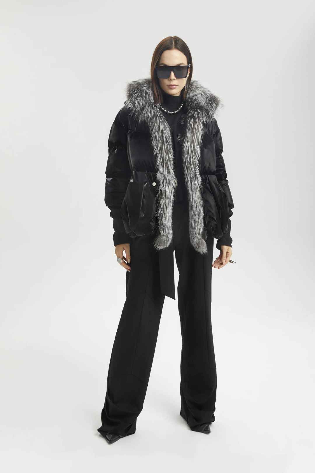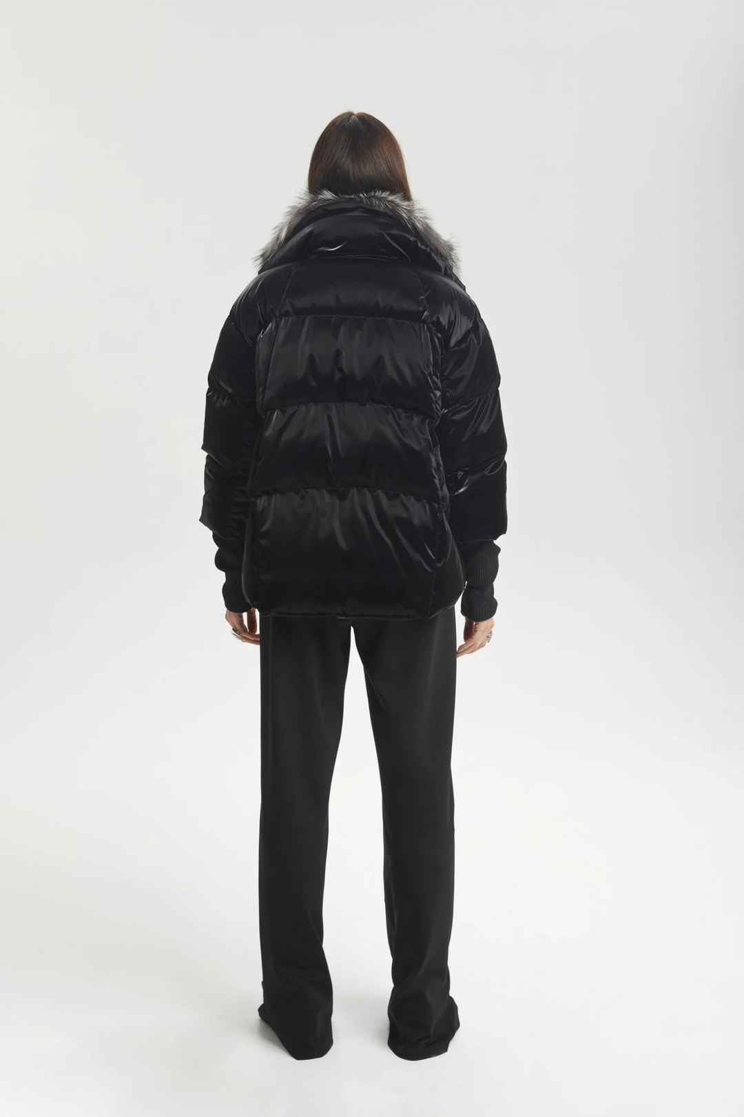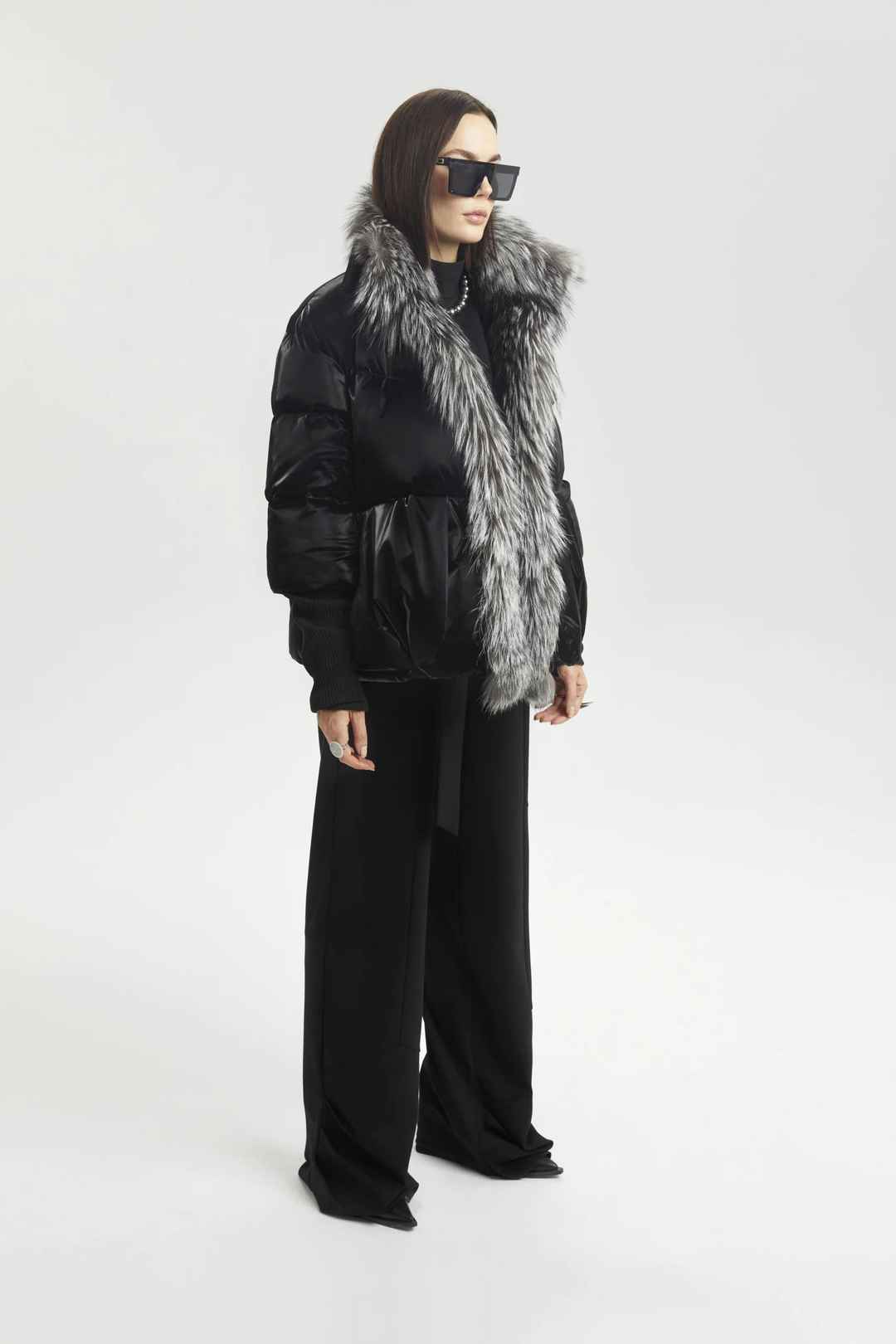 Black shine effect puffer jacket with a fox fur collar.