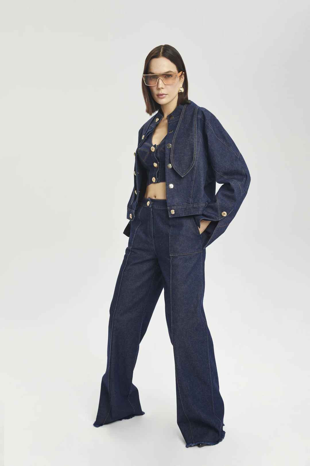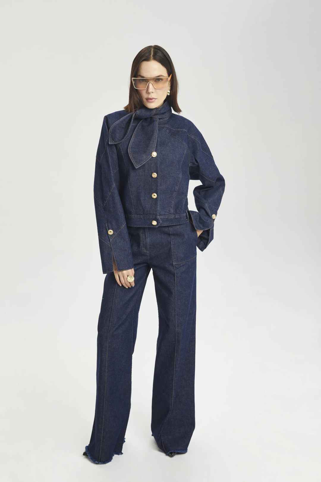 Long-sleeved denim jacket featuring slit sleeves, a tie neck detail, contrast stitching, and gold buttons.