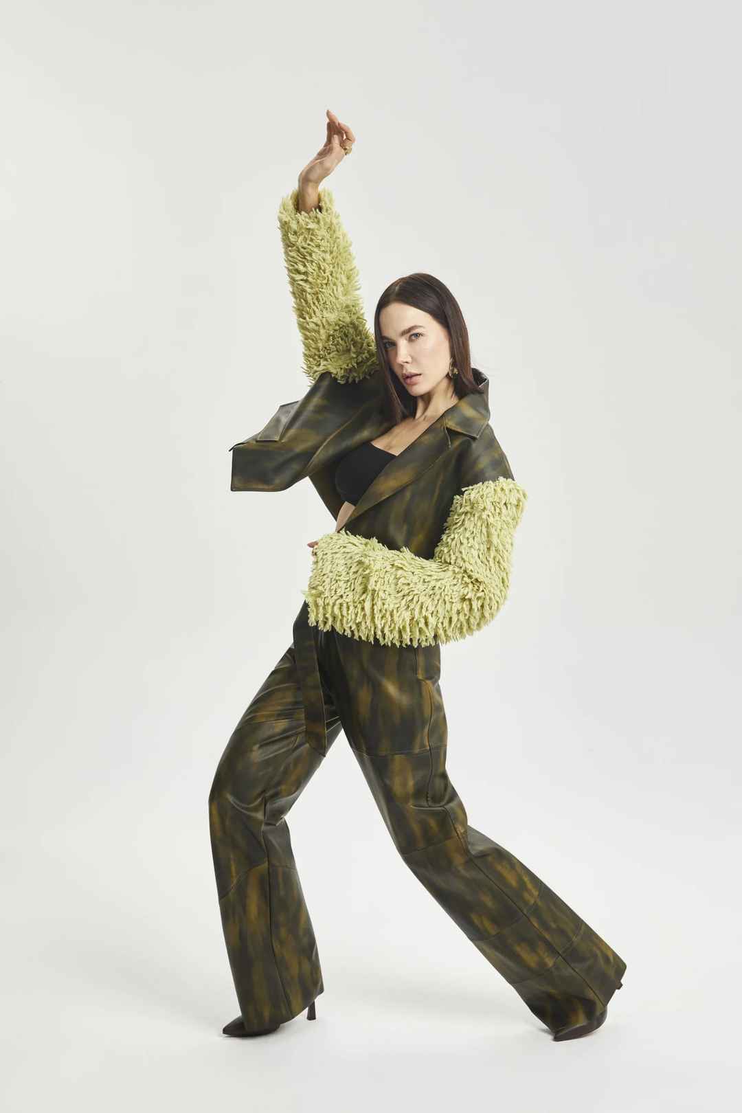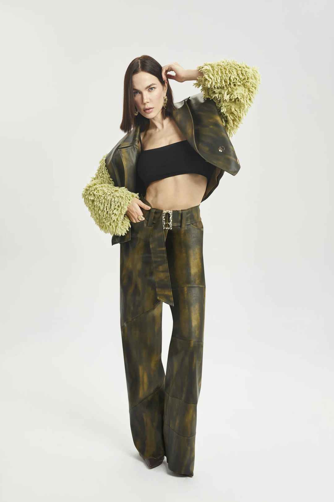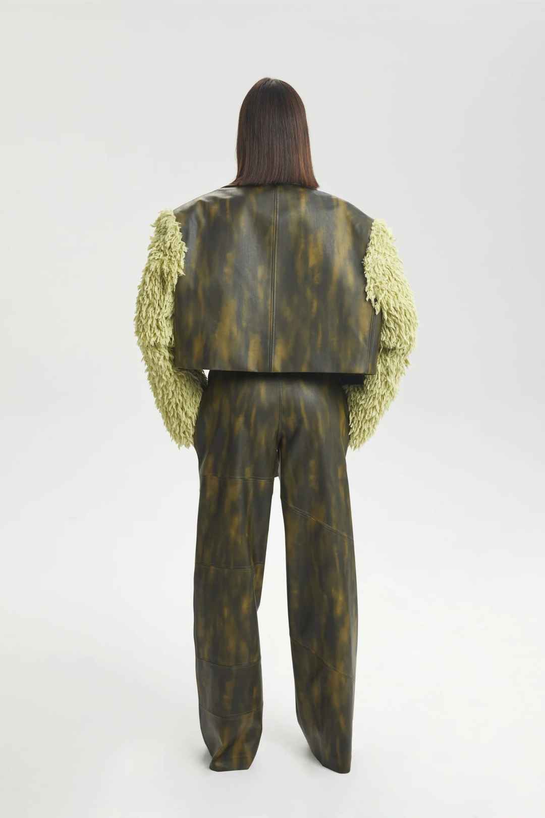 Cropped leather jacket with long faux fur sleeves and gradient color transition detailing.50% TURKISH PU 50% FIBER