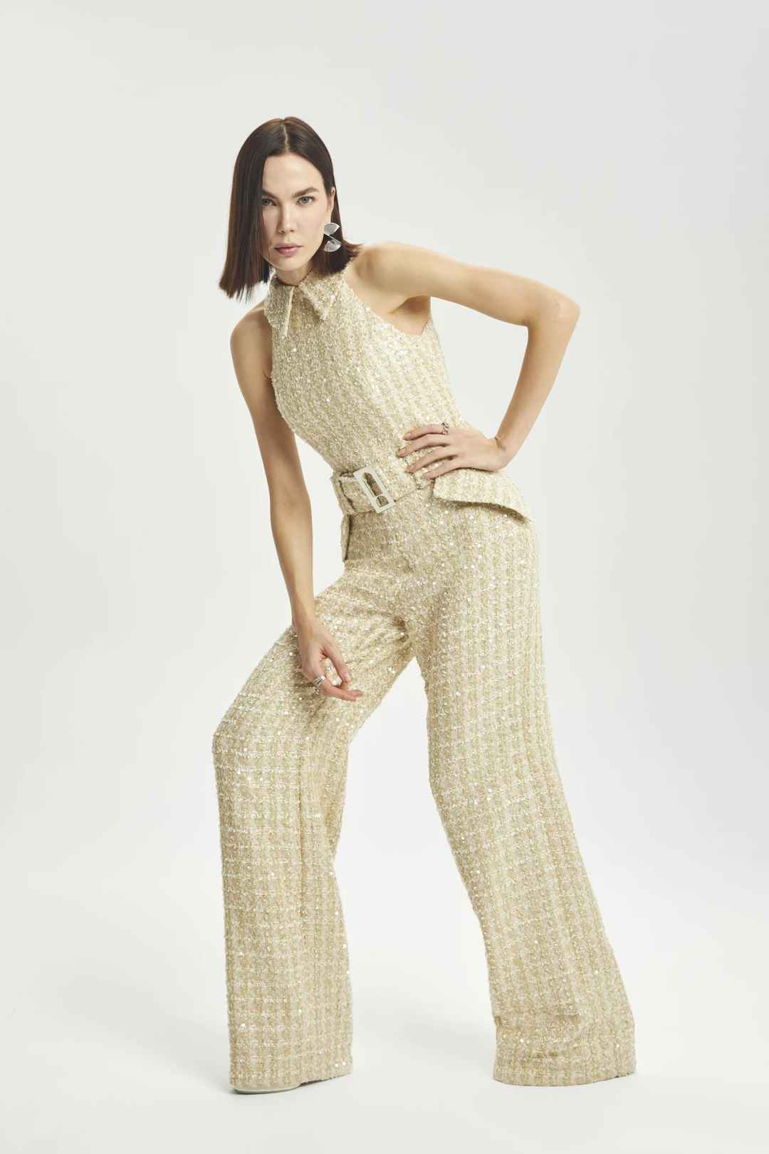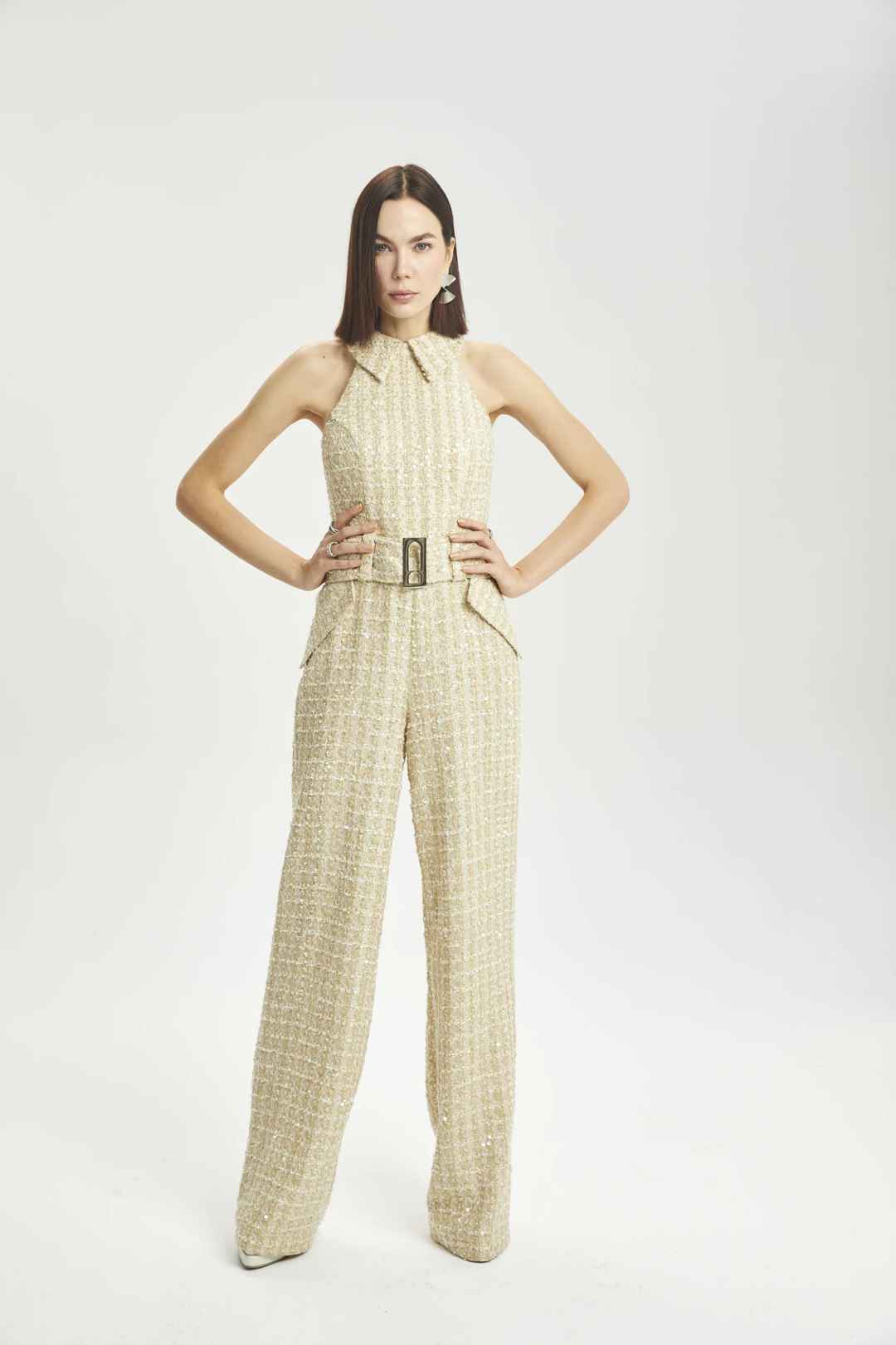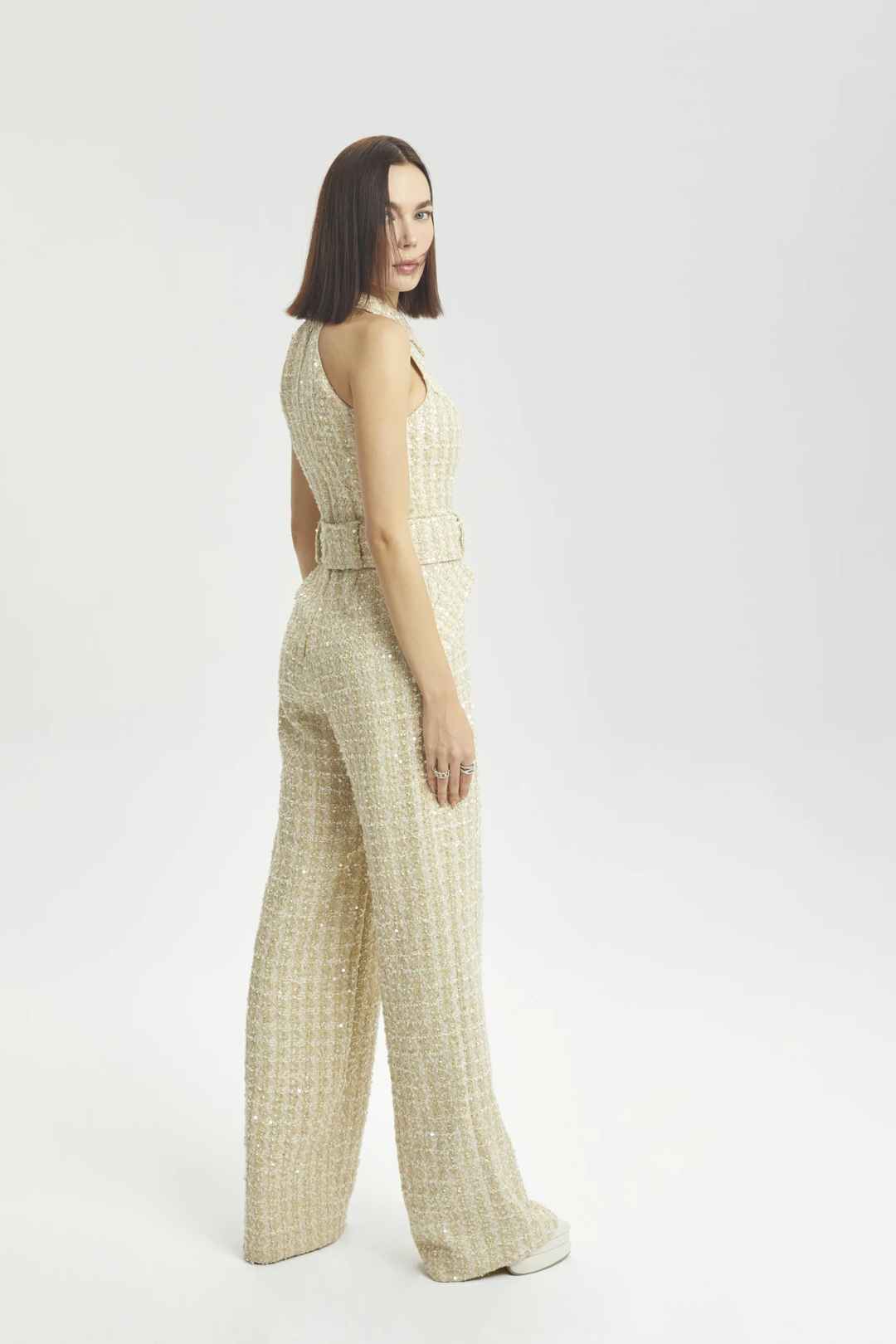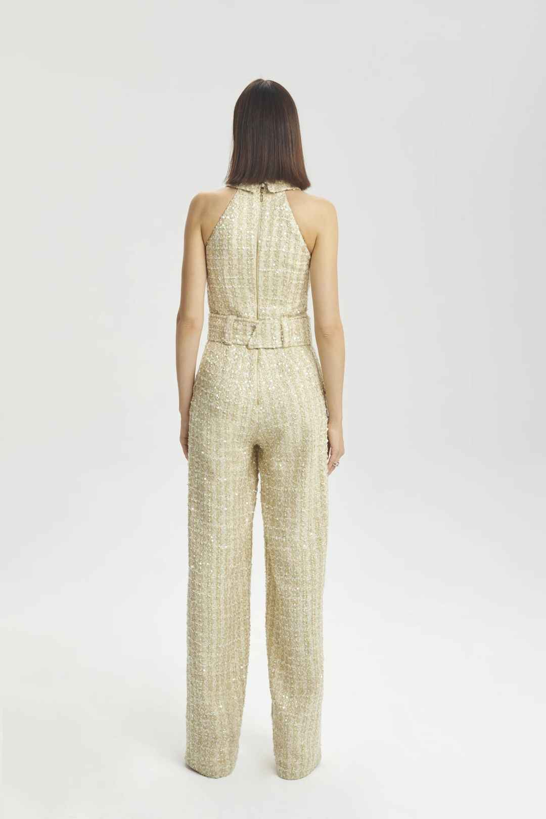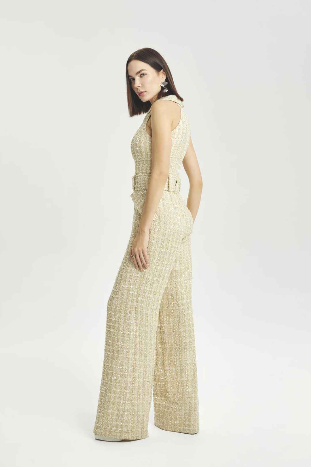 Sleevless sequin wide leg jumpsuit, side pocket detail with belt.