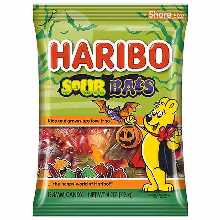 HARIBO Sour Bats Peg Bag offers sour & sweet bat-shaped gummies. Sour Bats are the perfect sweet treat for yourself or to share with a friend this Halloween season! Made in Germany