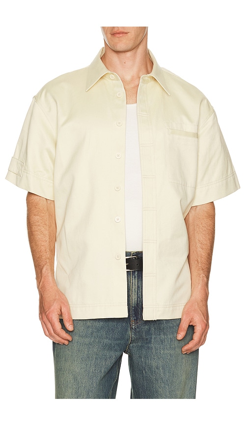 Helmut Lang Short Sleeve Loop Tape Shirt in Cream. - size L (also in S, XXL/2X) Helmut Lang Short Sleeve Loop Tape Shirt in Cream. - size L (also in S, XXL/2X) 100% cotton. Dry clean only. Front button closure. Chest slip pocket. Midweight twill fabric. HLAN-MS151. Q02HM502.