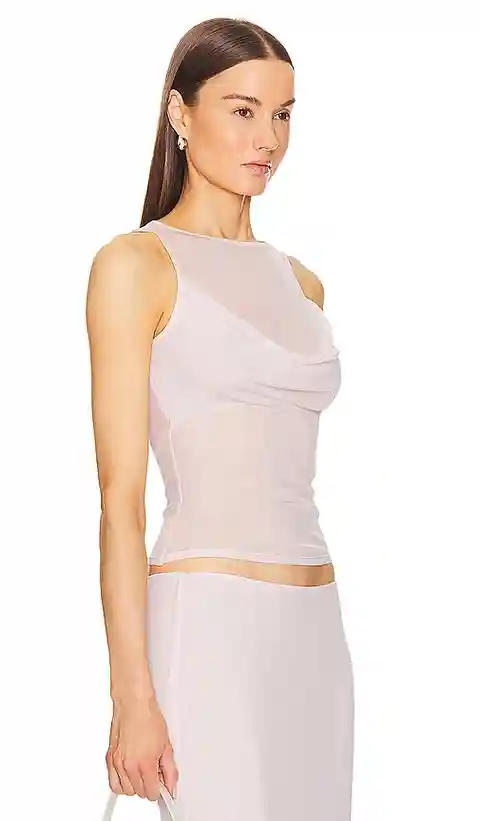 Helsa Sheer Knit Draped Top in Blush. - size L (also in M) Helsa Sheer Knit Draped Top in Blush. - size L (also in M) 100% viscose. Made in China. Hand wash. Draped fabric detail at bust. Semi-sheer mesh jersey fabric. Item not sold as a set. Garment is made with a semi-sheer fabric, undergarments c...more