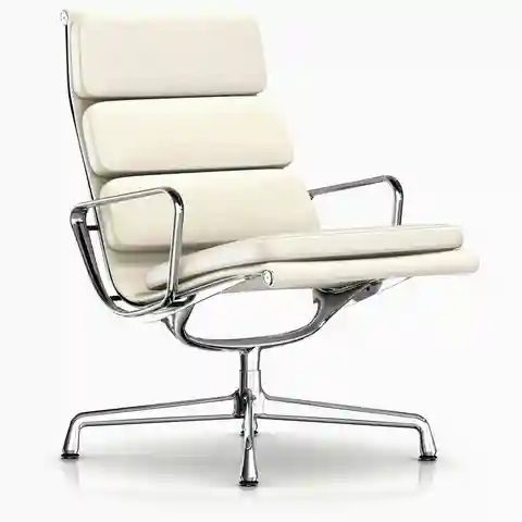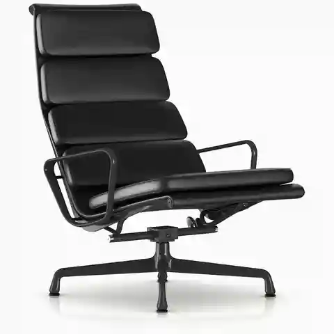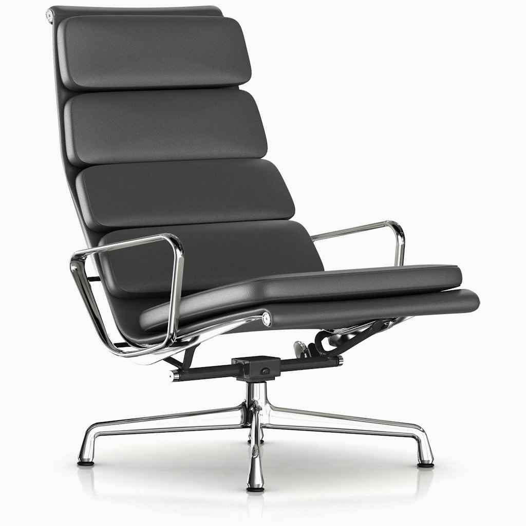 Designed as part of the iconic Aluminum Group, the Eames Soft Pad Lounge Chair has a high back, a relaxed pitch, and comes with its own pillowy headrest. | Herman Miller Eames Soft Pad Lounge Chair in Graphite | Leather