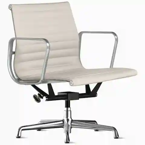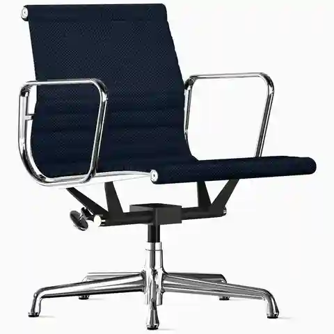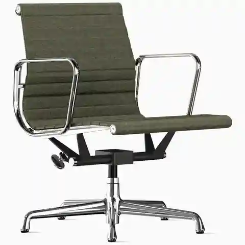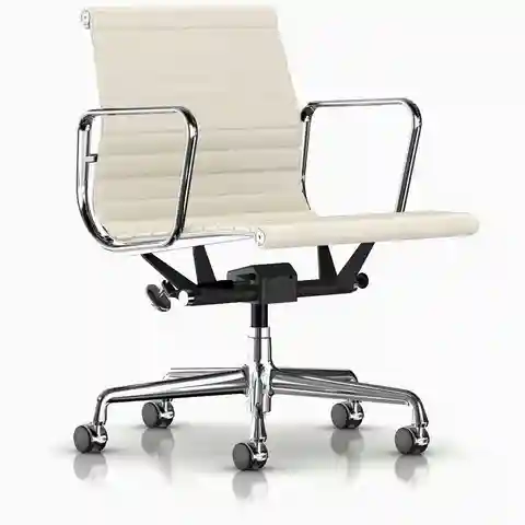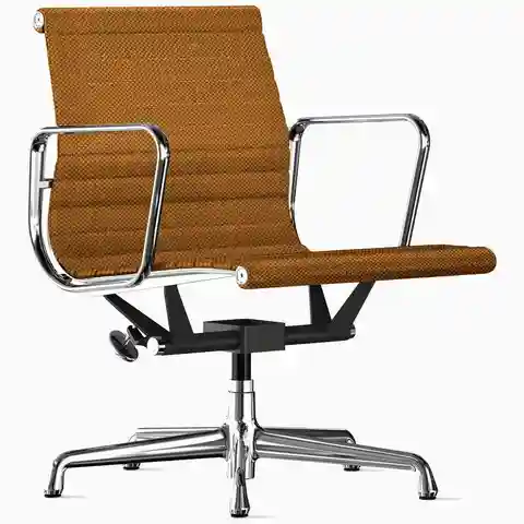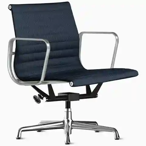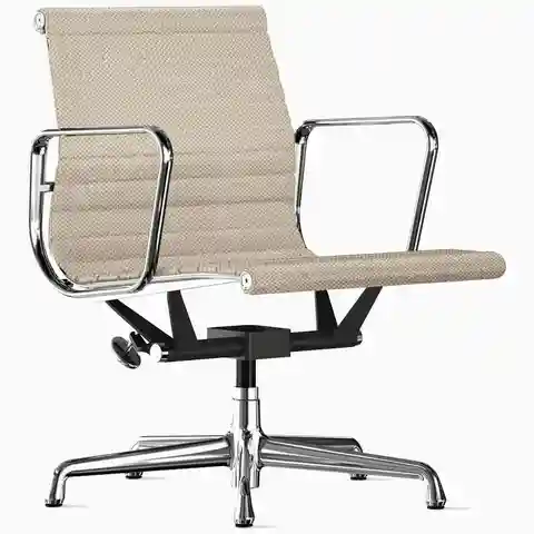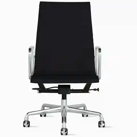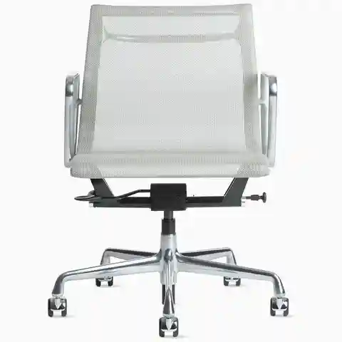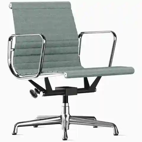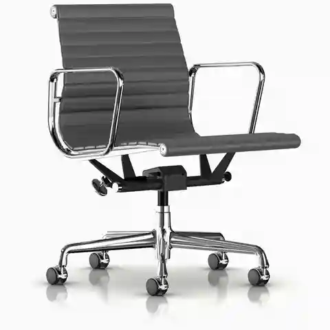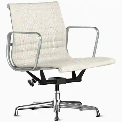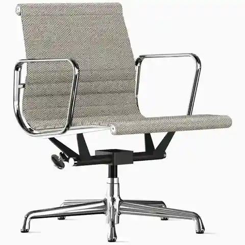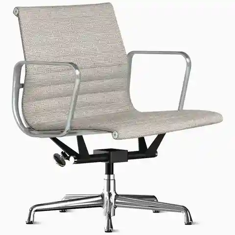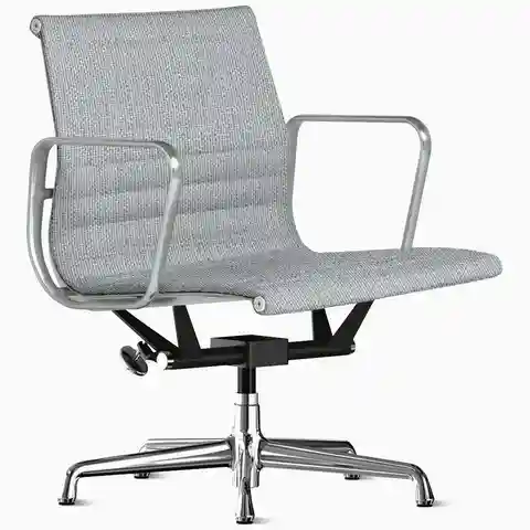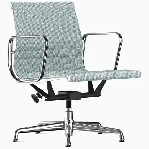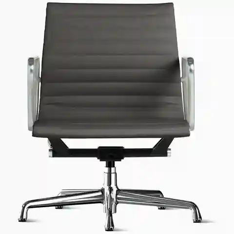 The Eames management chair is part of the Eames Aluminum Group Collection. These distinctive chairs resulted from the Eames''s experimentation with aluminum, which became more affordable after WWII. Today, the management chair has aluminum side ribs that hold the one-piece, seat-back suspension taug...more