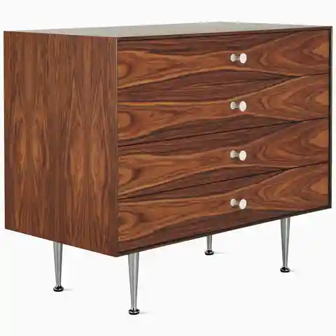 A timeless expression of fine woodcraft, the Nelson Thin Edge 4-Drawer Chest (1952) is also exceptionally sustainable, being manufactured with 85% recycled material. This versatile unit comprises four solid-wood drawers that rest upon slim aluminum legs; the legs lift the storage several inches off ...more