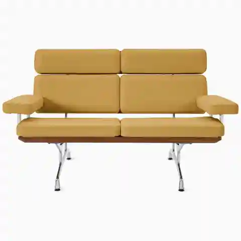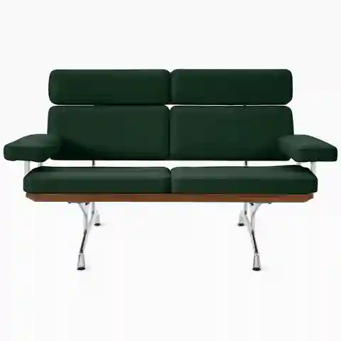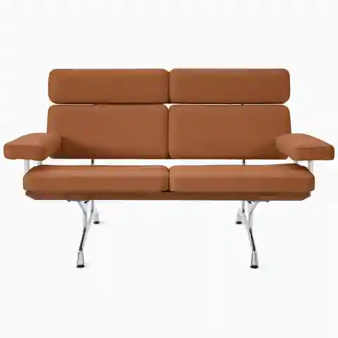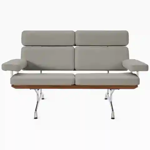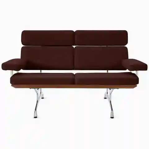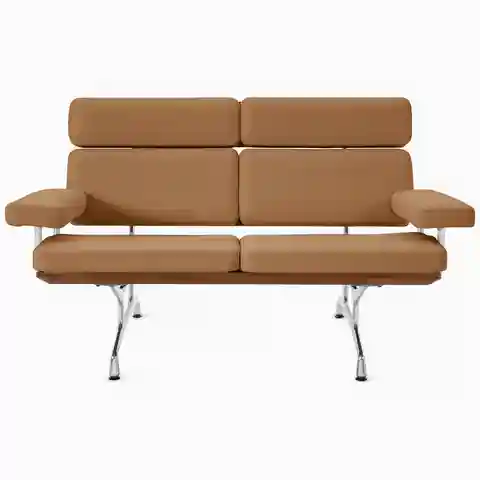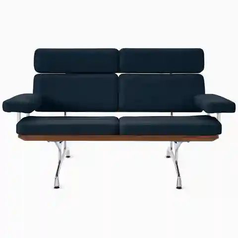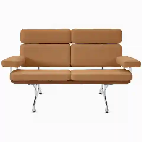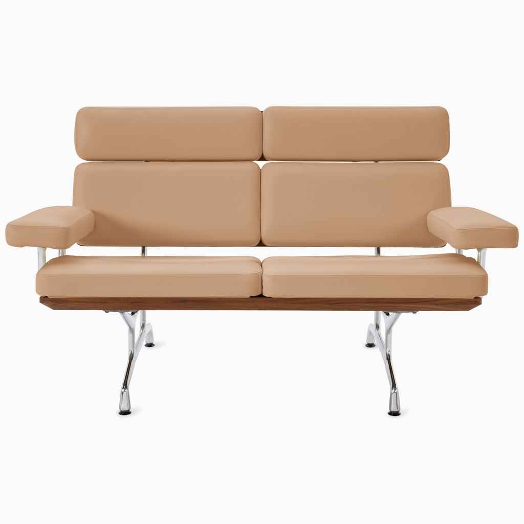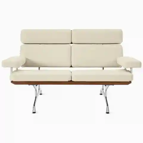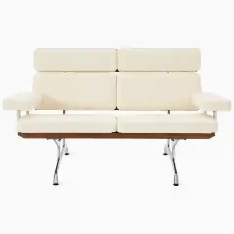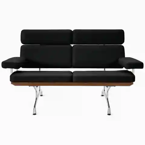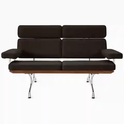 One of the last pieces of furniture from the Eames office, the Eames Sofa (1967) was designed to be a low-profile piece of furniture that would fit in the tightest of living spaces. This modern three-seat leather sofa features a solid wood back and frame panels finished with gunstock oil. Polished a...more