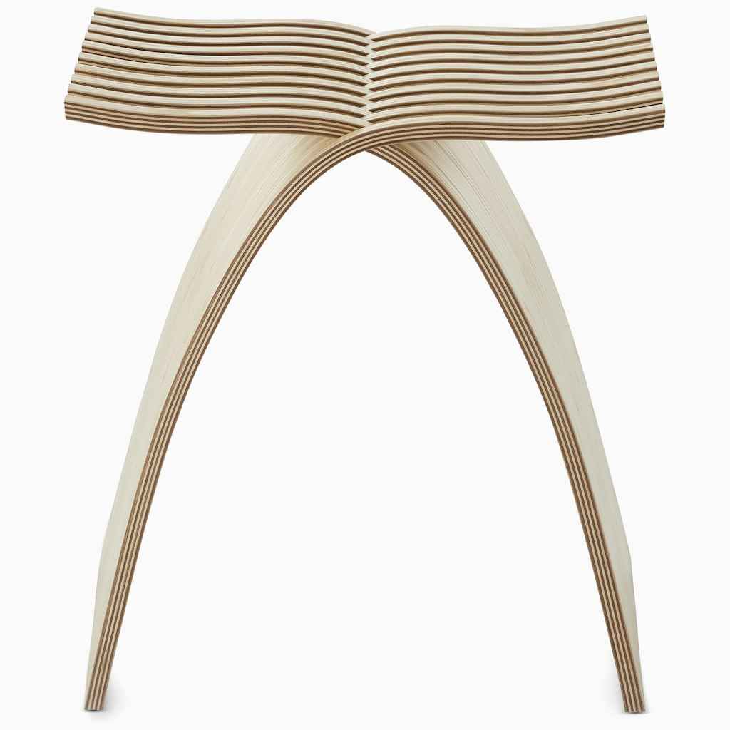 Constructed of two identical plywood pieces that interlock without tools, the Capelli Stool (2002) offers an ingeniously stable and remarkably strong structure. Each molded plywood piece comprises alternating dark- and light-stained hardwood inner plies with a light ash veneer. When not in use, the ...more