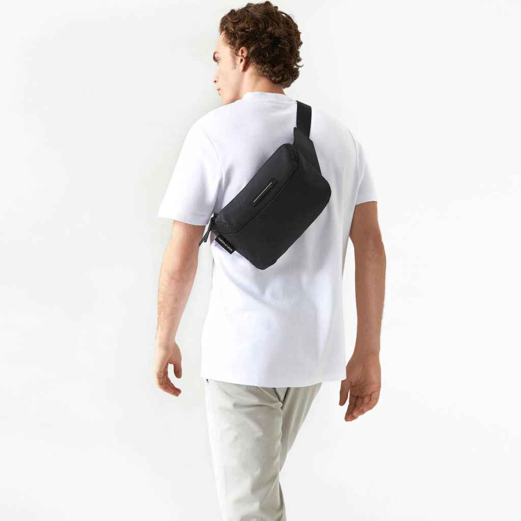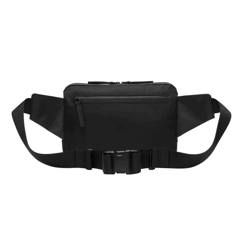 Waterproof design, vegan-tech materials. Two-way adjustable strap with premium metal hardware. Zippered main compartment with key clip & internal pockets. Zippered front and back compartments. .Rear padding for enhanced comfort Fits A5 notebook, iPad mini, wallet, passport, smartphone and more.