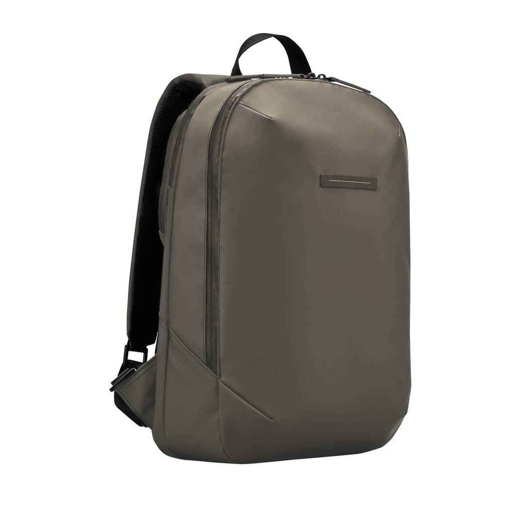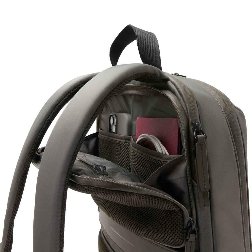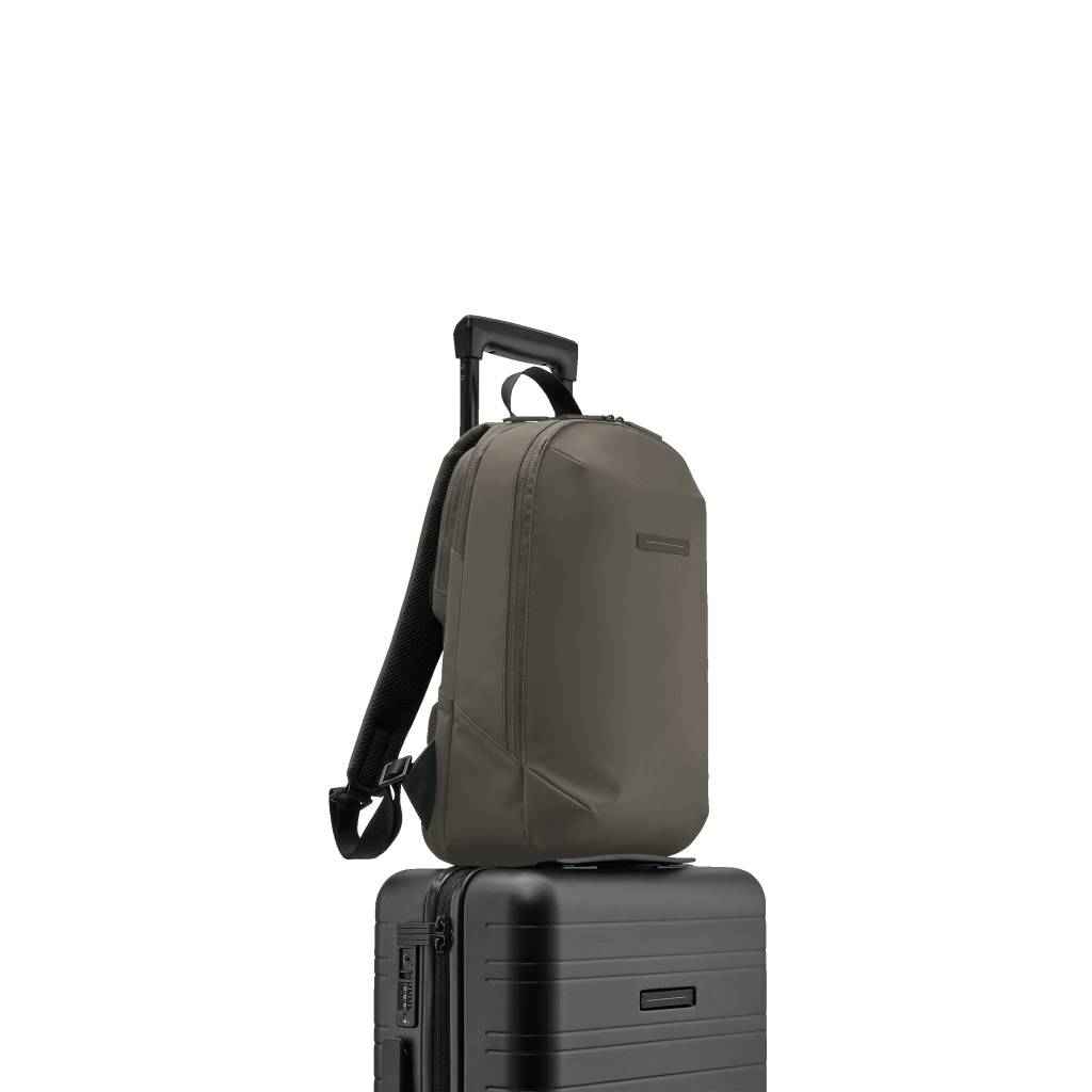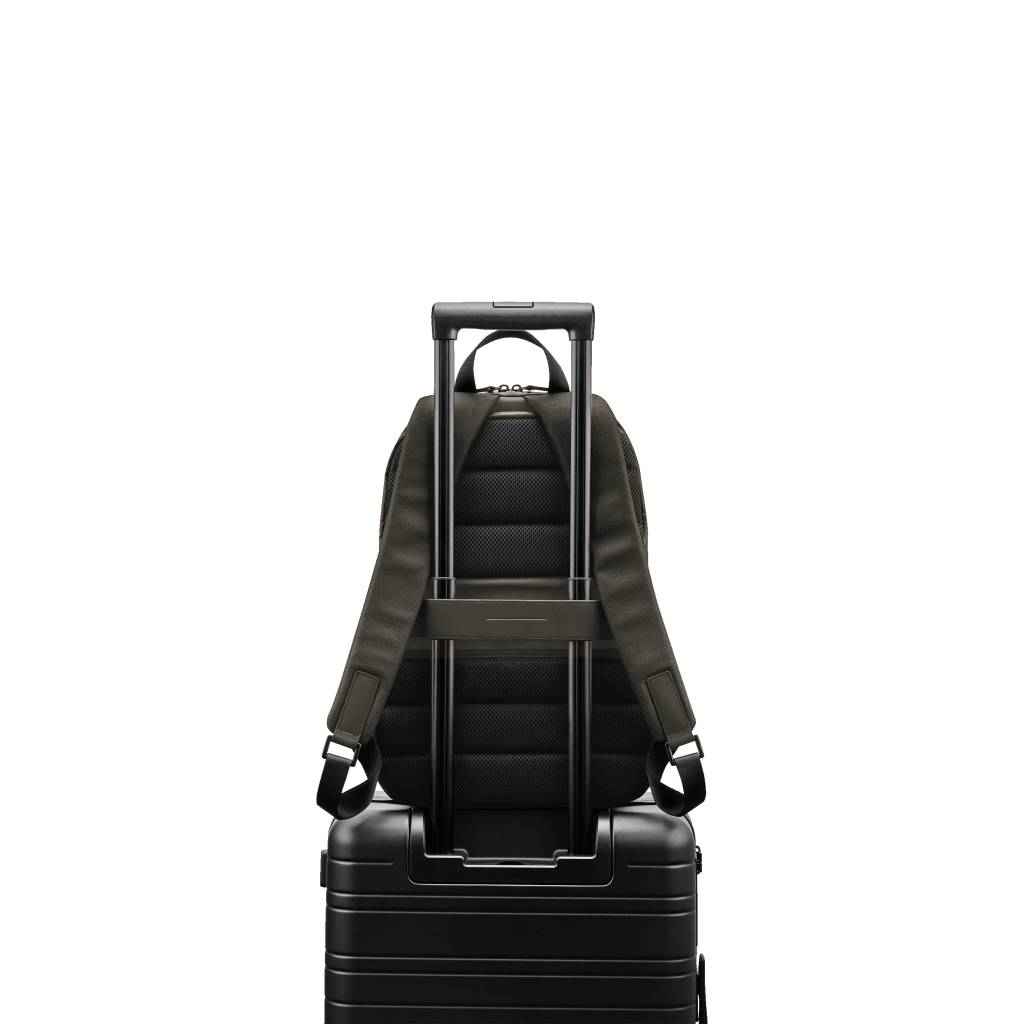 Space for up to 15 laptop. Water-resistant, vegan-tech materials. Smart protective compartments for technical devices and valuables. Highest ergonomic standards, ergo-padded back. .Hidden back pocket for travel essentials Premium strap to secure to Horizn luggage.