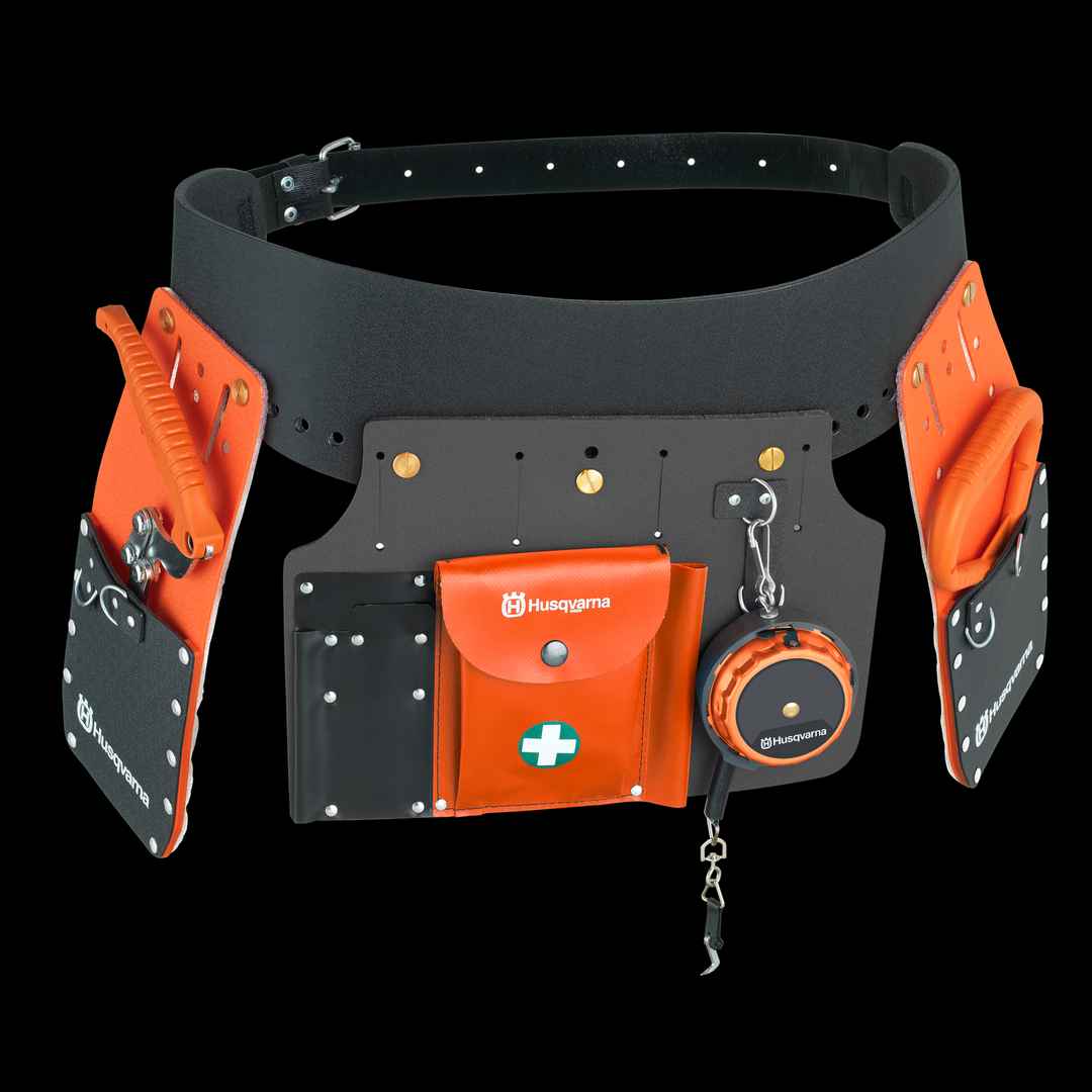 Tool belt complete in profiled box with tool belt, two holsters, rear tool carrier, lifting hook, lifting tong and measuring tape. 10% savings from individual pieces.