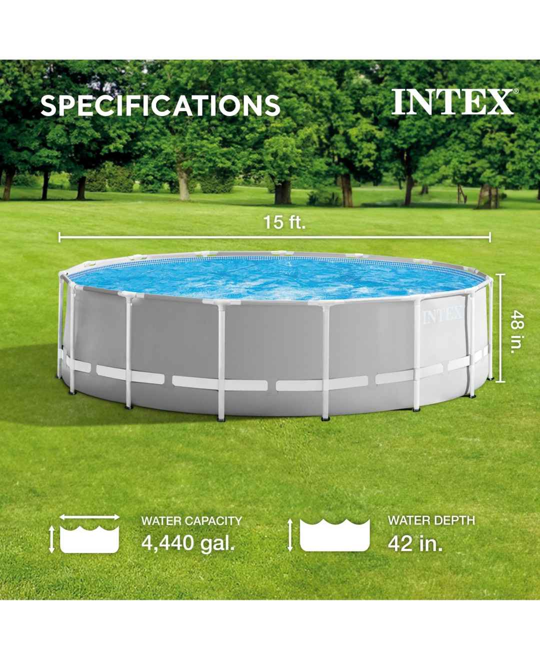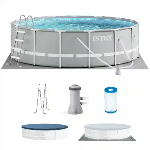 Make a major splash this summer with the Intex Prism Frame Pool Set.The Intex 15 Foot x 48-Inch Prism Frame Swimming Pool Set has everything you need to get the backyard pool parties going this summer. The upscale seafoam blue pool comes with a cartridge filter pump, a ladder, ground cloth, and a de...more