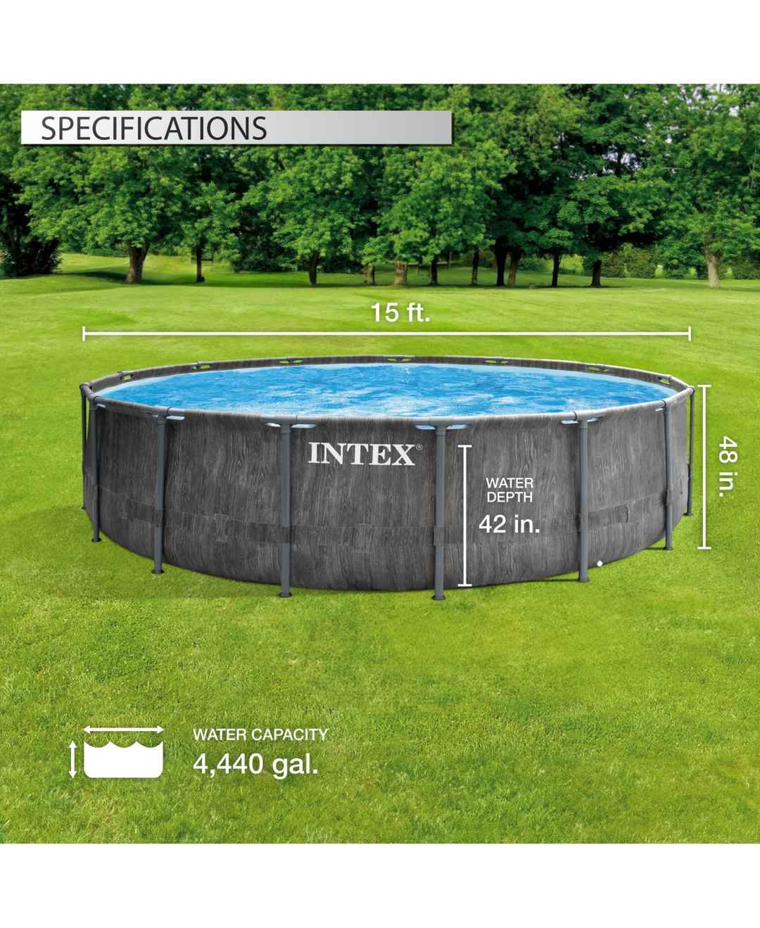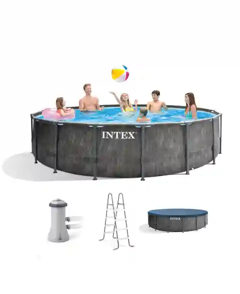 Whether you're hosting a summer get-together or need a day of relaxing, have everything you need with the Greywood Prism Frame Pool Set from Intex.Featuring a sophisticated woodgrain pattern, this pool provides a beautiful look and feel that will complement any backyard aesthetics. The sturdy frame ...more