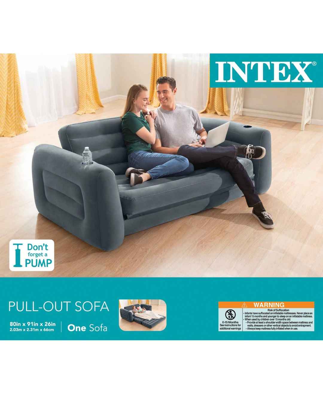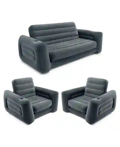 Sofa, sleeper, futon, bed, this 2-in-1 pullout designed for relaxing for just about anywhere is a must-have for your home. The Intex Queen Pull-Out Sofa Air Mattress and Inflatable Couch Furniture Set is versatile and goes from an inflatable sofa to a queen mattress momentarily. This pull-out sleepe...more