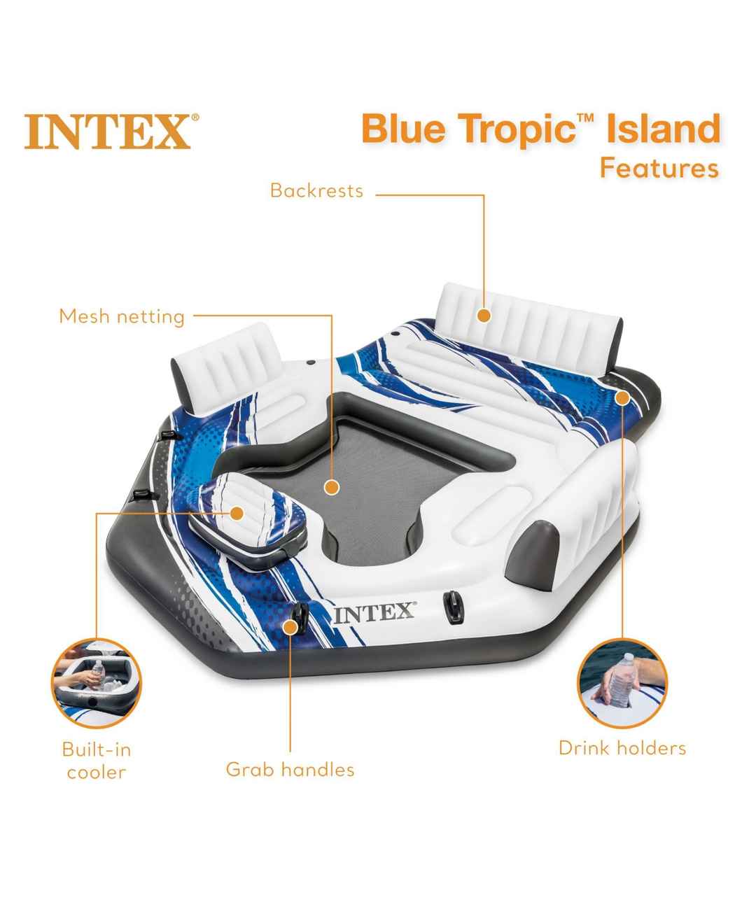 Intex Blue Tropic Inflatable Lake Island Water Float with Cooler and Cupholders - Blue
